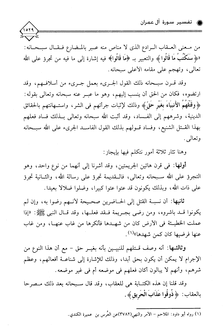 أولها: في قرن هاتين الجريمتين، وقد أشرنا إلى أنهما من نوع واحد، وهو التجرؤ على الله سبحانه وتعالى، فالقديمة تجرؤ على رسالة الله، والثانية تجرؤ على ذات الله، وبذلك يكونون قد عتوا عتوا كبيرا، وضلوا ضلالا بعيدا. ثانيها: أن نسبة القتل إلى الحاضرين صحيحة لأنهم رضوا به، وإن لم يكونوا قد باشروه، ومن رضي بجريمة فقد فعلها، وقد قال النبي - صلى الله عليه وسلم -: " إذا عملت الخطيئة في الأرض كان من شهدها فأنكرها من غاب عنها، ومن غاب عنها فرضيها كان كمن شهدها " (¬1).