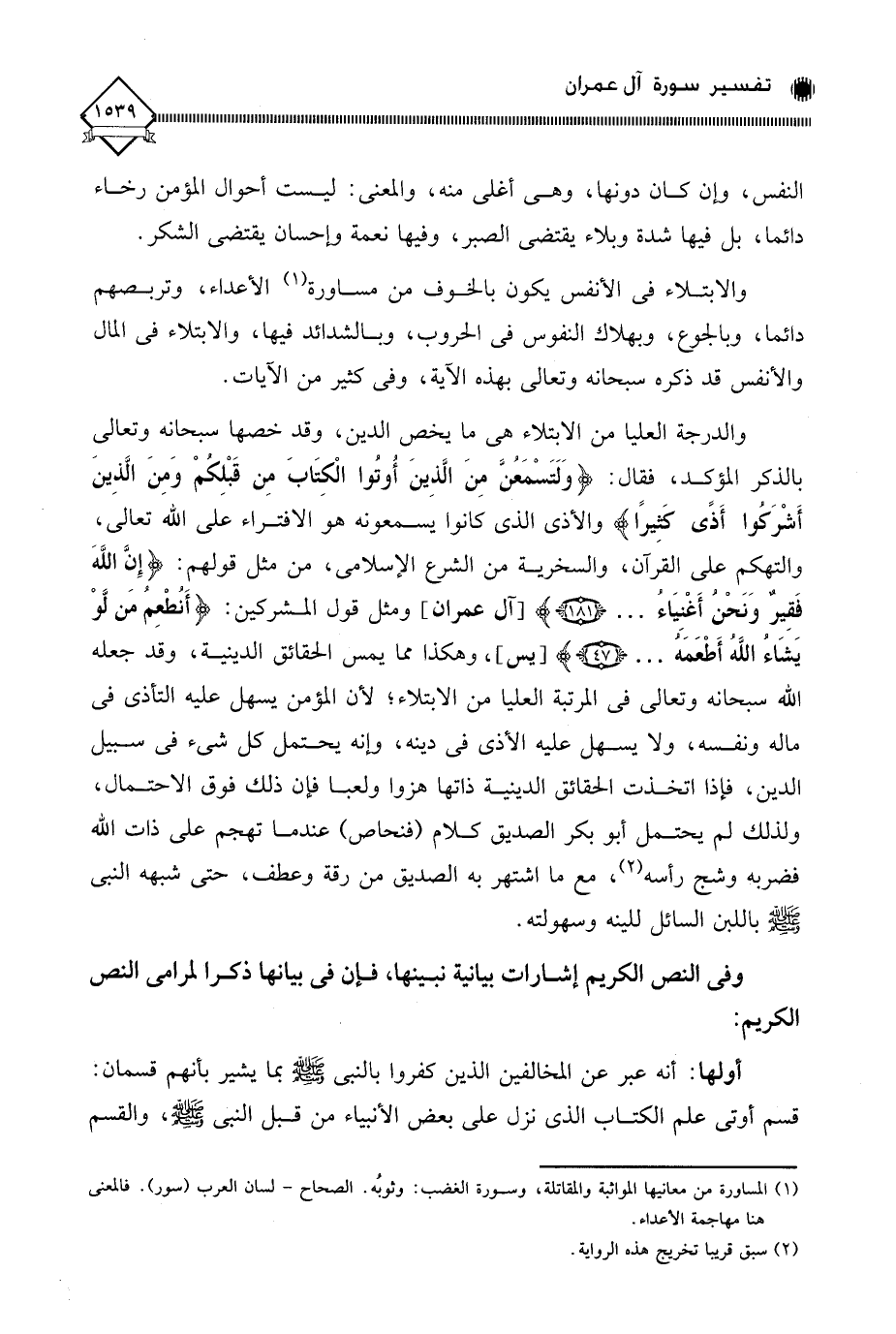 والدرجة العليا من الابتلاء هي ما يخص الدين، وقد خصها سبحانه وتعالى بالذكر المؤكد، فقال: (وَلَتَسْمَعُنَّ مِنَ الَّذِينَ أُوتُوا الْكِتَابَ مِنْ قَبْلِكُمْ وَمِنَ الَّذِينَ أَشْرَكُوا أَذًى كَثِيرًا) والأذى الذي كانوا يسمعونه هو الافتراء على الله تعالى، والتهكم على القرآن، والسخرية من الشرع الإسلامي، من مثل قولهم: (إِن اللَّهَ فَقِيرٌ وَنَحْنُ أَغْنِيَاءُ. . .)، ومثل قول المشركين: (أَئطْعِمُ مَن لَّوْ يَشَاءُ اللَّهُ أَطْعَمَهُ. . .)، وهكذا مما يمس الحقائق الدينية، وقد جعله الله سبحانه وتعالى في المرتبة العليا من الابتلاء، لأن المؤمن يسهل عليه التأذي في ماله ونفسه، ولا يسهل عليه الأذى في دينه، وإنه يحتمل كل شيء في سبيل الدين، فإذا اتخذت الحقائق الدينية ذاتها هزوا ولعبا فإن ذلك فوق الاحتمال، ولذلك لم يحتمل أبو بكر الصديق كلام (فنحاص) عندما تهجم على ذات الله فضربه وشج رأسه (¬2)، مع ما اشتهر به الصديق من رقة وعطف، حتى شبهه النبي - صلى الله عليه وسلم - باللبن السائل للينه وسهولته.