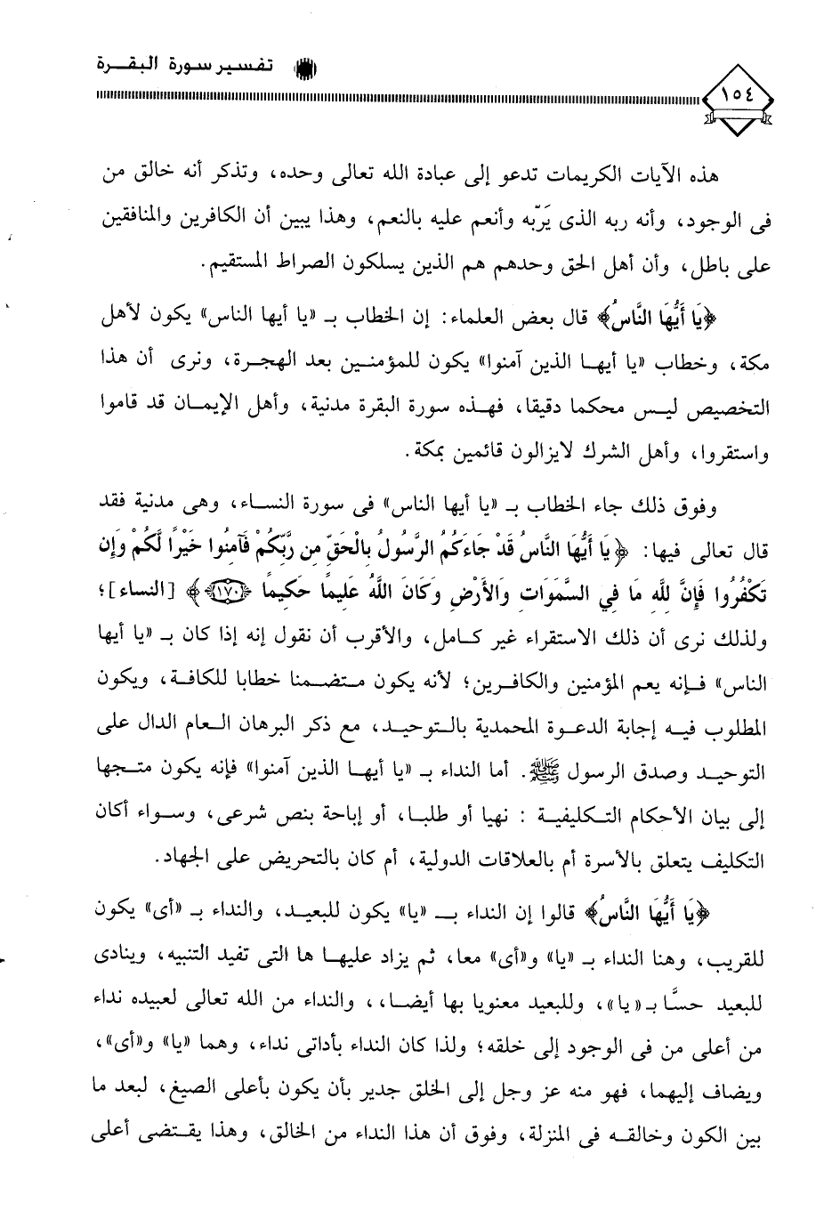 (يَا أَيهَا الناسُ) قال بعض العلماء: إن الخطاب بـ " يا أيها الناس " يكون لأهل مكة، وخطاب " يا أيها الذين آمنوأ يكون للمؤمنين بعد الهجرة، ونرى أن هذا التخصيص ليس محكما دقيقا، فهذه سورة البقرة مدنية، وأهل الإيمان قد قاموا واستقروا، وأهل الشرك لايزالون قائمين بمكة.