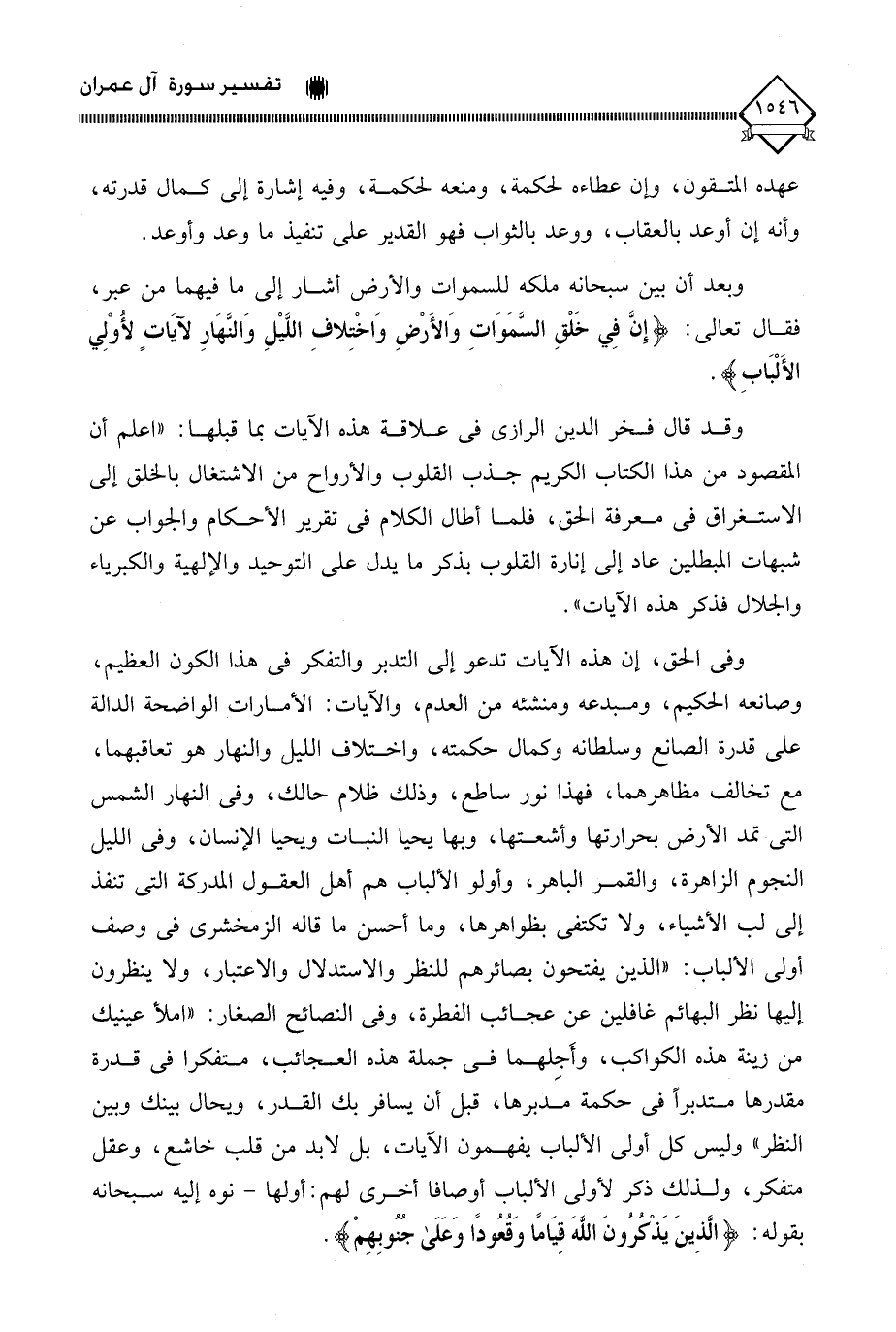 وفى الحق، إن هذه الآيات تدعو إلى التدبر والتفكر في هذا الكون العظيم، وصانعه الحكيم، ومبدعه ومنشئه من العدم، والآيات: الأمارات الواضحة الدالة على قدرة الصانع وسلطانه وكمال حكمته، واختلاف الليل والنهار هو تعاقبهما، مع تخالف مظاهرهما، فهذا نور ساطع، وذلك ظلام حالك، وفي النهار الشمس التي تمد الأرض بحرارتها وأشعتها، وبها يحيا النبات ويحيا الإنسان، وفي الليل النجوم الزاهرة، والقمر الباهر، وأولو الألباب هم أهل العقول المدركة التي تنفذ إلى لب الأشياء، ولا تكتفي بظواهرها، وما أحسن ما قاله الزمخشري في وصف أولي الألباب: " الذين يفتحون بصائرهم للنظر والاستدلال والاعتبار، ولا ينظرون إليها نظر البهائم غافلين عن عجائب الفطرة، وفي النصائح الصغار: " املأ عينيك من زينة هذه الكواكب، وأَجِلهما في جملة هذه العجائب، متفكرا في قدرة مقدرها متدبراً في حكمة مدبرها، قبل أن يسافر بك القدر، ويحال بينك وبين النظر " وليس كل أولي الألباب يفهمون الآيات، بل لابد من قلب خاشع، وعقل متفكر، ولذلك ذكر لأولي الألباب أوصافا أخرى لهم: أولها - نوه إليه سبحانه بقوله: