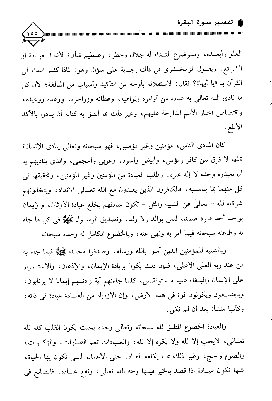 كان المنادى الناس، مؤمنين وغير مؤمنين، فهو سبحانه وتعالى ينادي الإنسانية كلها لَا فرق بين كافر ومؤمن، وأبيض وأسود، وعربي وأعجمي، والذي يناديهم به أن يعبدوه وحده لَا إله غيره. وطلب العبادة من المؤمنين وغير المؤمنين، وتحقيقها في كل منهما بما يناسبه، فالكافرون الذين يعبدون مع الله تعالى الأنداد، ويتخذونهم شركاء لله - تعالى عن الشبيه والمثل - تكون عبادتهم بخلع عبادة الأوثان، والإيمان بواحد أحد فرد صمد، ليس بوالد ولا ولد، وتصديق الرسول - صلى الله عليه وسلم - في كل ما جاء به وطاعته سبحانه فيما أمر به ونهى عنه، وبالخضوع الكامل له وحده سبحانه.