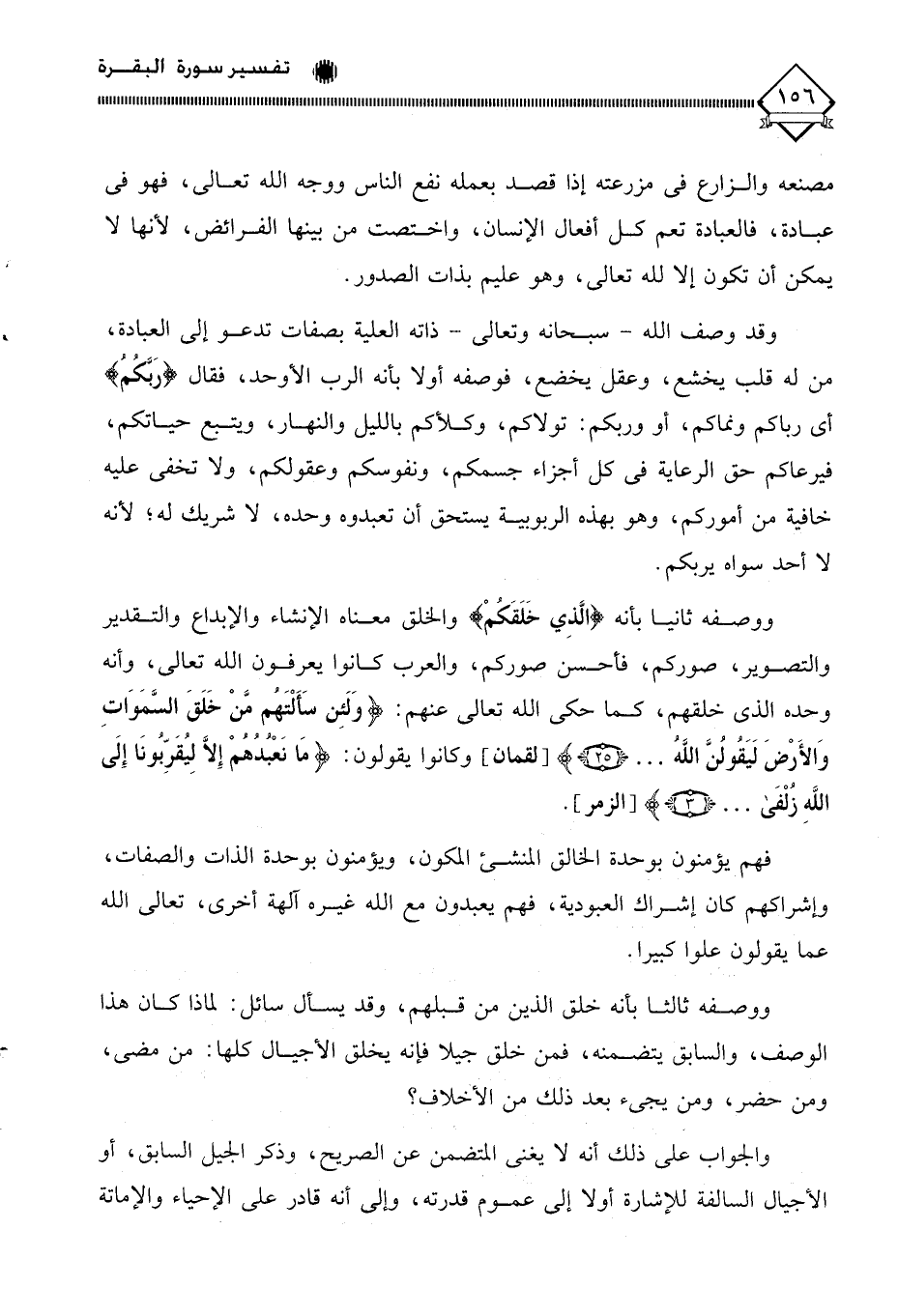 ووصفه ثانيا بأنه (الَّذِي خَلَقَكُمْ) والخلق معناه الإنشاء والإبداع والتقدير والتصوير، صوركم، فأحسن صوركم، والعرب كانوا يعرفون الله تعالى، وأنه وحده الذي خلقهم، كما حكى الله تعالى عنهم: (وَلَئِن سَأَلْتَهم مَّنْ خَلَقَ السَّمَاوَاتِ وَالأَرْضَ لَيَقُولُنَّ اللَّهُ. . .) وكانوا يقولون: (مَا نَعْبُدُهُمْ إِلَّا لِيُقَرِّبُونَا إِلَى اللَّهِ زُلْفَى. . .).