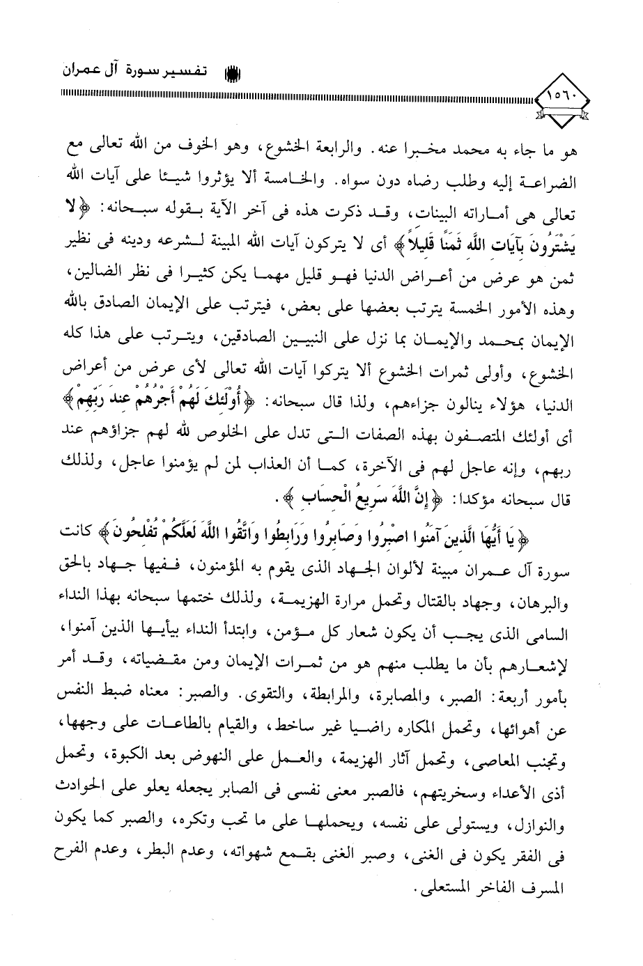هو ما جاء به محمد مخبرا عنه والرابعة الخشوع، وهو الخوف من الله تعالى مع الضراعة إليه وطلب رضاه دون سواه. والخامسة ألا يؤثروا شيئا على آيات الله تعالى هي أماراته البينات، وقد ذكرت هذه في آخر الآية بقوله سبحانه: (لا يَشْتَرُونَ بِآيَاتِ اللَّهِ ثَمَنًا قَلِيلًا) أي لَا يتركون آيات الله البينة لشرعه ودينه في نظير ثمن هو عرض من أعراض الدنيا فهو قليل مهما يكن كثيرا في نظر الضالين، وهذه الأمور الخمسة يترتب بعضها على بعض، فيترتب على الإيمان الصادق بالله الإيمان بمحمد والإيمان بما نزل على النبيين الصادقين، ويترتب على هذا كله الخشوع، وأولى ثمرات الخشوع ألا يتركوا آيات الله تعالى لأي عرض من أعراض الدنيا، هؤلاء ينالون جزاءهم، ولذا قال سبحانه: (أُوْلَئِكَ لَهُمْ أَجْرُهُمْ عِندَ رَبِّهِمْ) أي أولئك المتصفون بهذه الصفات التي تدل على الخلوص لله لهم جزاؤهم عند ربهم، وإنه عاجل لهم في الآخرة، كما أن العذاب لمن لم يؤمنوا عاجل، ولذلك قال سبحانه مؤكدا: (إِنَّ اللَّهَ سَرِيعُ الْحِسَابِ).