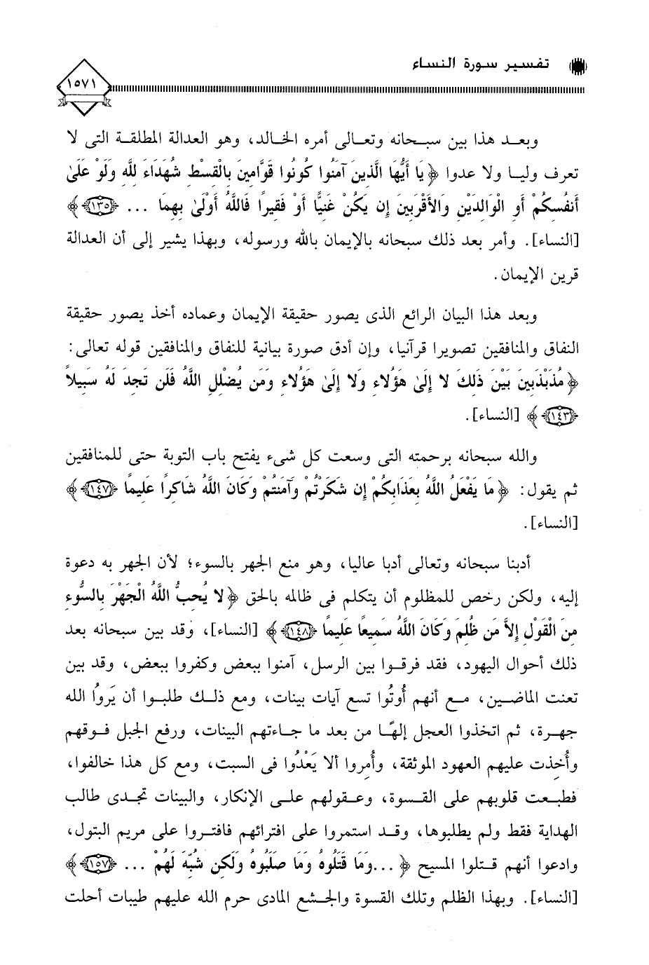 وبعد هذا البيان الرائع الذي يصور حقيقة الإيمان وعماده أخذ يصور حقيقة النفاق والمنافقين تصويرا قرآنيا، وإن أدق صورة بيانية للنفاق والمنافقين قوله تعالى: (مُذَبْذَبِينَ بَيْنَ ذَلِكَ لَا إِلَى هَؤُلَاءِ وَلا إِلَى هَؤُلَاءِ وَمَن يُضْلِلِ اللَّهُ فَلَن تَجِدَ لَهُ سَبِيلًا). والله سبحانه برحمته التي وسعت كل شيء يفتح باب التوبة حتى للمنافقين ثم يقول: (مَا يَفْعَلُ اللَّهُ بِعَذَابِكُمْ إِن شَكَرْتُمْ وَآمَنتُمْ وَكَانَ اللَّهُ شَاكِرًا عَلِيمًا). أدبنا سبحانه وتعالى أدبا عاليا، وهو منع الجهر بالسوء؛ لأن الجهر به دعوة إليه، ولكن رخص للمظلوم أن يتكلم في ظالمه بالحق (لا يُحِبُّ اللَّهُ الْجَهْرَ بِالسُّوءِ مِنَ الْقَوْلِ إِلَّا مَن ظُلِمَ وَكَانَ اللَّهُ سَمِيعًا عَلِيمًا)، وقد بين سبحانه بعد ذلك أحوال اليهود، فقد فرقوا بين الرسل، آمنوا ببعض وكفروا ببعض، وقد بين تعنت الماضين، مع أنهم أُوتُوا تسع آيات بينات، ومع ذلك طلبوا أن يَروُا الله جهرة، ثم اتخذوا العجل إلهًا من بعد ما جاءتهم البينات، ورفع الجبل فوقهم وأُخِذت عليهم العهود الموثقة، وأُمِروا ألا يَعْدُوا في السبت، ومع كل هذا خالفوا، فطبعت قلوبهم على القسوة، وعقولهم على الإنكار، والبينات تجدي طالب الهداية فقط ولم يطلبوها، وقد استمروا على افترائهم فافتروا على مريم البتول، وادعوا أنهم قتلوا المسيح (. . . وَمَا قَتَلُوهُ وَمَا صَلَبُوهُ وَلَكِن شُبِّة لَهُمْ. . .).