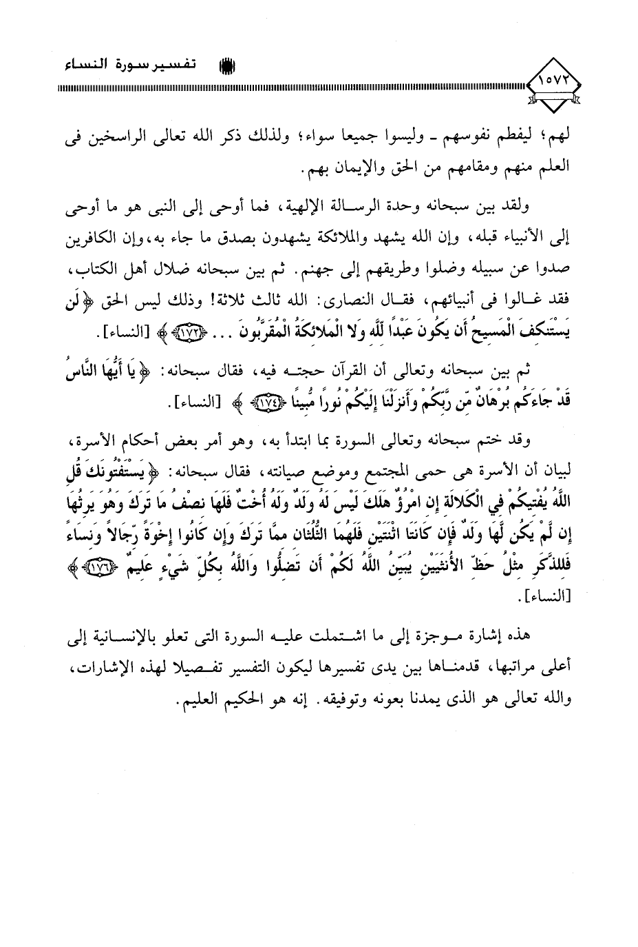 وقد ختم سبحانه وتعالى السورة بما ابتدأ به، وهو أمر بعض أحكامِ الأسرة، لبيان أن الأسرة هي حمى المجتمع وموضع صيانته، فقال سبحانه: (يَسْتَفْتُونَكَ قُلِ اللَّهُ يُفْتِيكُمْ فِي الْكَلَالَةِ إِنِ امْرُؤٌ هَلَكَ لَيْسَ لَهُ وَلَدٌ وَلَهُ أُخْتٌ فَلَهَا نِصْفُ مَا تَرَكَ وَهُوَ يَرِثُهَا إِنْ لَمْ يَكُنْ لَهَا وَلَدٌ فَإِنْ كَانَتَا اثْنَتَيْنِ فَلَهُمَا الثُّلُثَانِ مِمَّا تَرَكَ وَإِنْ كَانُوا إِخْوَةً رِجَالًا وَنِسَاءً فَلِلذَّكَرِ مِثْلُ حَظِّ الْأُنْثَيَيْنِ يُبَيِّنُ اللَّهُ لَكُمْ أَنْ تَضِلُّوا وَاللَّهُ بِكُلِّ شَيْءٍ عَلِيمٌ (176).