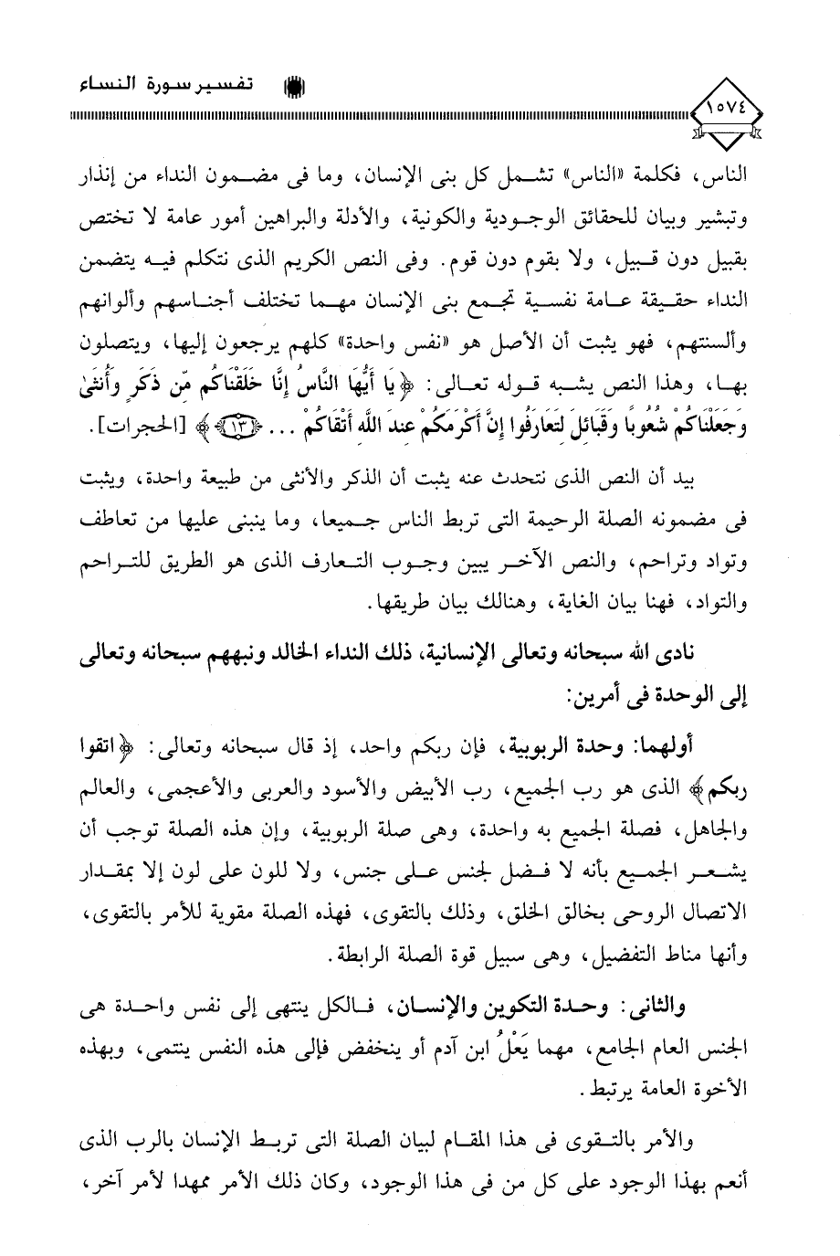 نادى الله سبحانه وتعالى الإنسانية، ذلك النداء الخالد ونبههم سبحانه وتعالى إلى الوحدة في أمرين: