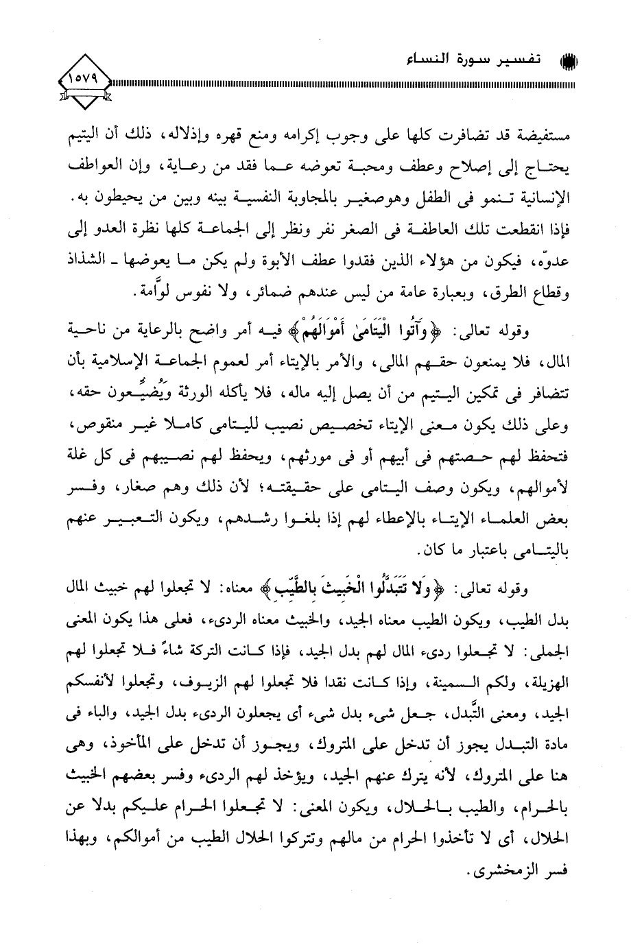 وقوله تعالى: (وَلا تَتَبَدَّلُوا الْخَبِيثَ بِالطَّيِّبِ) معناه: لَا تجعلوا لهم خبيث المال بدل الطيب، ويكون الطيب معناه الجيد، والخبيث معناه الرديء، فعلى هذا يكون المعنى الجملي: لَا تجعلوا رديء المال لهم بدل الجيد، فإذا كانت التركة شاءً فلا تجعلوا لهم الهزيلة، ولكم السمينة، وإذا كانت نقدا فلا تجعلوا لهم الزيوف، وتجعلوا لأنفسكم الجيد، ومعنى التَّبدل، جعل شيء بدل شيء أي يجعلون الرديء بدل الجيد، والباء في مادة التبدل يجوز أن تدخل على المتروك، ويجوز أن تدخل على المأخوذ، وهي هنا على المتروك، لأنه يترك عنهم الجيد، ويؤخذ لهم الرديء وفسر بعضهم الخبيث بالحرام، والطيب بالحلال، ويكون المعنى: لَا تجعلوا الحرام عليكم بدلا عن الحلال، أي لَا تأخذوا الحرام من مالهم وتتركوا الحلال الطيب من أموالكم، وبهذا فسر الزمخشري.