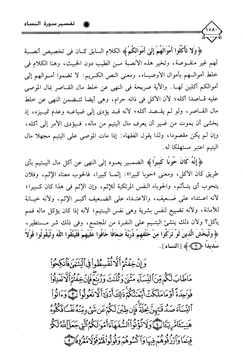 (وَإِنْ خِفْتُمْ أَلَّا تُقْسِطُوا فِي الْيَتَامَى فَانْكِحُوا مَا طَابَ لَكُمْ مِنَ النِّسَاءِ مَثْنَى وَثُلَاثَ وَرُبَاعَ فَإِنْ خِفْتُمْ أَلَّا تَعْدِلُوا فَوَاحِدَةً أَوْ مَا مَلَكَتْ أَيْمَانُكُمْ ذَلِكَ أَدْنَى أَلَّا تَعُولُوا (3) وَآتُوا النِّسَاءَ صَدُقَاتِهِنَّ نِحْلَةً فَإِنْ طِبْنَ لَكُمْ عَنْ شَيْءٍ مِنْهُ نَفْسًا فَكُلُوهُ هَنِيئًا مَرِيئًا (4) وَلَا تُؤْتُوا السُّفَهَاءَ أَمْوَالَكُمُ الَّتِي جَعَلَ اللَّهُ لَكُمْ قِيَامًا وَارْزُقُوهُمْ فِيهَا وَاكْسُوهُمْ وَقُولُوا لَهُمْ قَوْلًا مَعْرُوفًا (5)