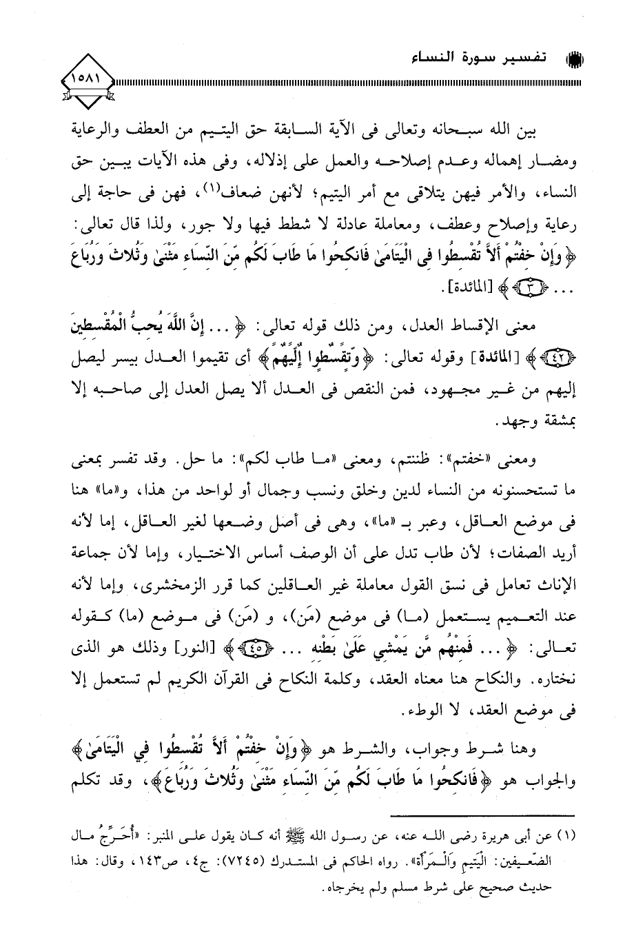 بين الله سبحانه وتعالى في الآية السابقة حق اليتيم من العطف والرعاية ومضار إهماله وعدم إصلاحه والعمل على إذلاله، وفي هذه الآيات يبين حق النساء، والأمر فيهن يتلاقى مع أمر اليتيم، لأنهن ضعاف (¬1)، فهن في حاجة إلى رعاية وإصلاح وعطف، ومعاملة عادلة لَا شطط فيها ولا جور، ولذا قال تعالى:
