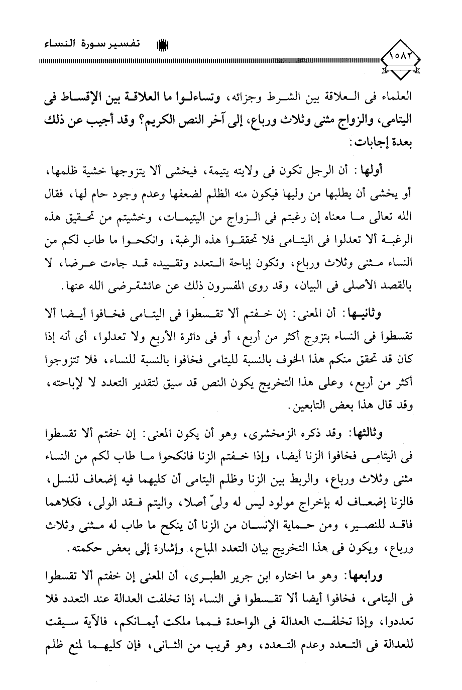 ورابعها: وهو ما اختاره ابن جرير الطبري، أن المعنى إن خفتم ألا تقسطوا في اليتامى، فخافوا أيضا ألا تقسطوا في النساء إذا تخلفت العدالة عند التعدد فلا تعددوا، وإذا تخلفت العدالة في الواحدة فمما ملكت أيمانكم، فالآية سيقت للعدالة في التعدد وعدم التعدد، وهو قريب من الثاني، فإن كليهما لمنع ظلم