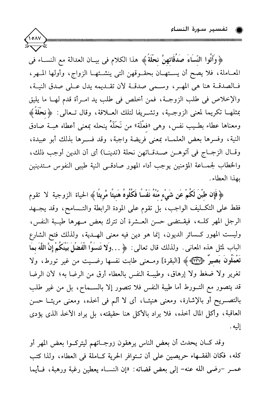 (فَإِن طِبْنَ لَكُمْ عَن شَيْءٍ مِّنْهُ نَفْسًا فَكُلُوهُ هَنِيئًا مَّرِيئًا) الحياة الزوجية لَا تقوم فقط على التكليف الواجب، بل تقوم على المودة الرابطة والتسامح، وقد يجهد الرجل الهر كله، فيقتضي حسن العشرة أن تترك بعض مهرها طيبة النفس، وليست المهور كسائر الديون، إنما هو دين فيه معنى الهدية، ولذلك فتح الشارع الباب لمثل هذه المعاني. ولذلك قال تعالى: (. . . وَلا تَنسَوُا الْفَضْلَ بَيْنَكُمْ إِنَّ اللَّهَ بِمَا تَعْمَلُونَ بَصِيرٌ)، ومعنى طابت نفسها رضيت من غير تورط، ولا تغرير ولا ضغط ولا إرهاق، وطيبة النفس بالعطاء أرق من الرضا به؛ لأن الرضا قد يتصور مع التورط أما طيبة النفس فلا تتصور إلا بالسماح، بل من غير طلب بالتصريح أو بالإشارة، ومعنى هنيئا، أي لَا ألم في أخذه، ومعنى مريئا حسن العاقبة، وأكل المال أخذه، فلا يراد بالأكل هنا حقيقته، بل يراد الأخذ الذي يؤدي إليه.