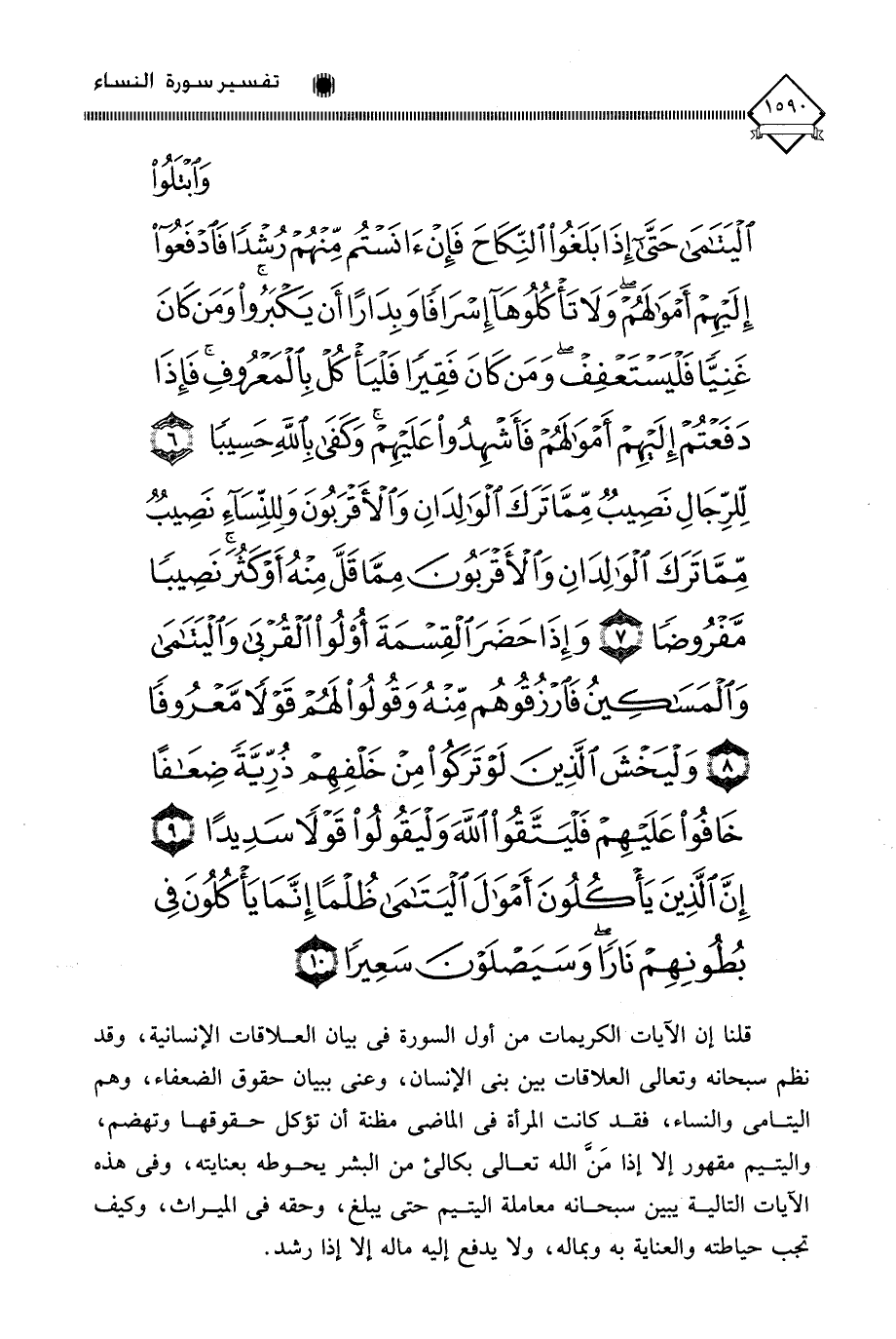 (وَابْتَلُوا الْيَتَامَى حَتَّى إِذَا بَلَغُوا النِّكَاحَ فَإِنْ آنَسْتُمْ مِنْهُمْ رُشْدًا فَادْفَعُوا إِلَيْهِمْ أَمْوَالَهُمْ وَلَا تَأْكُلُوهَا إِسْرَافًا وَبِدَارًا أَنْ يَكْبَرُوا وَمَنْ كَانَ غَنِيًّا فَلْيَسْتَعْفِفْ وَمَنْ كَانَ فَقِيرًا فَلْيَأْكُلْ بِالْمَعْرُوفِ فَإِذَا دَفَعْتُمْ إِلَيْهِمْ أَمْوَالَهُمْ فَأَشْهِدُوا عَلَيْهِمْ وَكَفَى بِاللَّهِ حَسِيبًا (6) لِلرِّجَالِ نَصِيبٌ مِمَّا تَرَكَ الْوَالِدَانِ وَالْأَقْرَبُونَ وَلِلنِّسَاءِ نَصِيبٌ مِمَّا تَرَكَ الْوَالِدَانِ وَالْأَقْرَبُونَ مِمَّا قَلَّ مِنْهُ أَوْ كَثُرَ نَصِيبًا مَفْرُوضًا (7) وَإِذَا حَضَرَ الْقِسْمَةَ أُولُو الْقُرْبَى وَالْيَتَامَى وَالْمَسَاكِينُ فَارْزُقُوهُمْ مِنْهُ وَقُولُوا لَهُمْ قَوْلًا مَعْرُوفًا (8) وَلْيَخْشَ الَّذِينَ لَوْ تَرَكُوا مِنْ خَلْفِهِمْ ذُرِّيَّةً ضِعَافًا خَافُوا عَلَيْهِمْ فَلْيَتَّقُوا اللَّهَ وَلْيَقُولُوا قَوْلًا سَدِيدًا (9) إِنَّ الَّذِينَ يَأْكُلُونَ أَمْوَالَ الْيَتَامَى ظُلْمًا إِنَّمَا يَأْكُلُونَ فِي بُطُونِهِمْ نَارًا وَسَيَصْلَوْنَ سَعِيرًا (10)