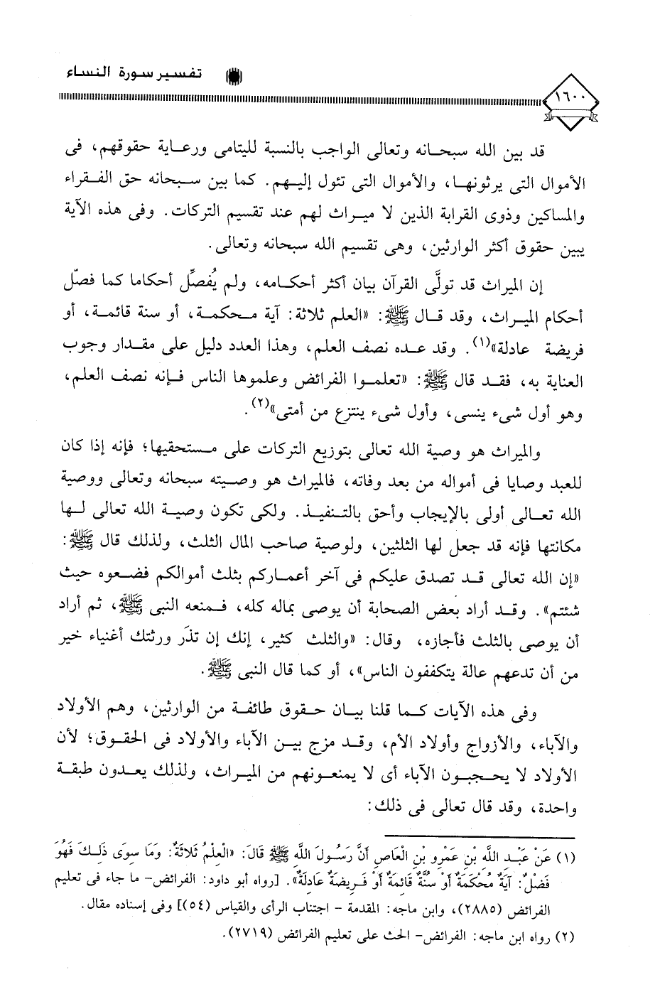 (¬1) عَنْ عَبْد اللَّهِ بْنِ عَمْرِو بنِ الْعَاصِ ان رَسُولَ اللَّهِ - صلى الله عليه وسلم - قَالَ: " العِلْمُ ثَلاثَةٌ: وَمَا سِوَى ذَلِكَ فَهُوَ فَضْلٌ: آيًةٌ محْكَمَةٌ أوْ سُنَّةٌ قَائِمَةٌ أوْ فَرِيضَةٌ عَادِلَةٌ ". [رواه أبو داود: الفرائض - ما جاء في تعليم الفرائض (2885)، وابن ماجه: المقدمة - اجتناب الرأي والقياس (54)، وفي إسناده مقال.