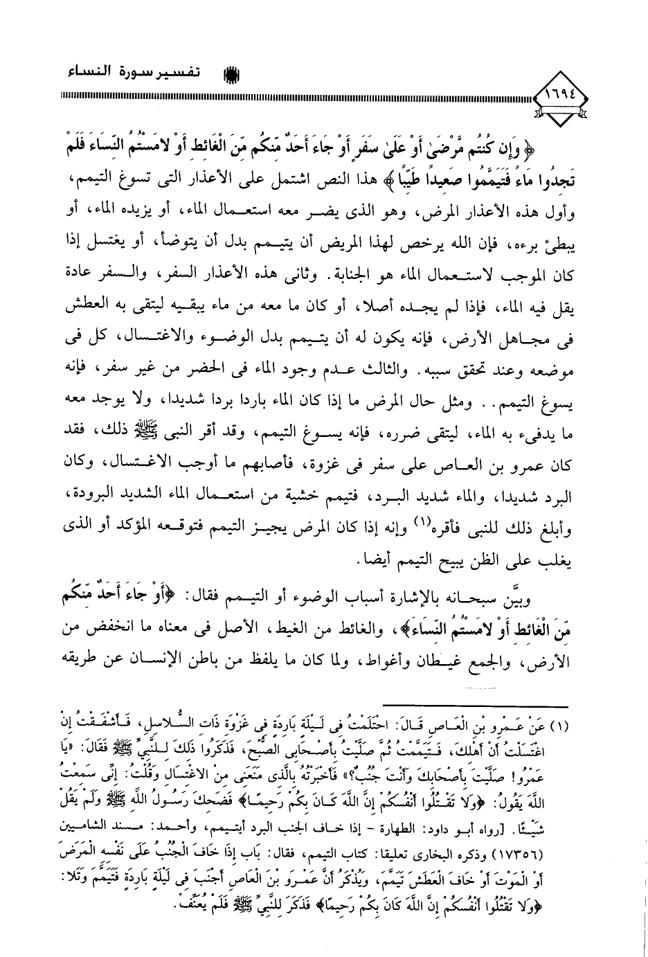 (وَإِنْ كُنْتُمْ مَرْضَى أَوْ عَلَى سَفَرٍ أَوْ جَاءَ أَحَدٌ مِنْكُمْ مِنَ الْغَائِطِ أَوْ لَامَسْتُمُ النِّسَاءَ فَلَمْ تَجِدُوا مَاءً فَتَيَمَّمُوا صَعِيدًا طَيِّبًا) هذا النص اشتمل على الأعذار التي تسوغ التيمم، وأول هذه الأعذار المرض، وهو الذي يضر معه استعمال الماء، أو يزيده الماء، أو يبطئ برءه، فإن الله يرخص لهذا المريض أن يتيمم بدل أن يتوضأ، أو يغتسل إذا كان الموجب لاستعمال الماء هو الجنابة. وثاني هذه الأعذار السفر، والسفر عادة يقل فيه الماء، فإذا لم يجده أصلا، أو كان ما معه من ماء يبقيه ليتقى به العطش في مجاهل الأرض، فإنه يكون له أن يتيمم بدل الوضوء والاغتسال، كل في موضعه وعند تحقق سببه. والثالث عدم وجود الماء في الحضر من غير سفر، فإنه يسوغ التيمم. . ومثل حال المرض ما إذا كان الماء باردا بردا شديدا، ولا يوجد معه ما يدفئ به الماء، ليتقى ضرره، فإنه يسوغ التيمم، وقد أقر النبي - صلى الله عليه وسلم - ذلك، فقد كان عمرو بن العاص على سفر في غزوة، فأصابهم ما أوجب الاغتسال، وكان البرد شديدا، والماء شديد البرد، فتيمم خشية من استعمال الماء الشديد البرودة، وأبلغ ذلك للنبي فأقره (¬1) وإنه إذا كان المرض يجيز التيمم فتوقعه المؤكد أو الذي يغلب على الظن يبيح التيمم أيضا.