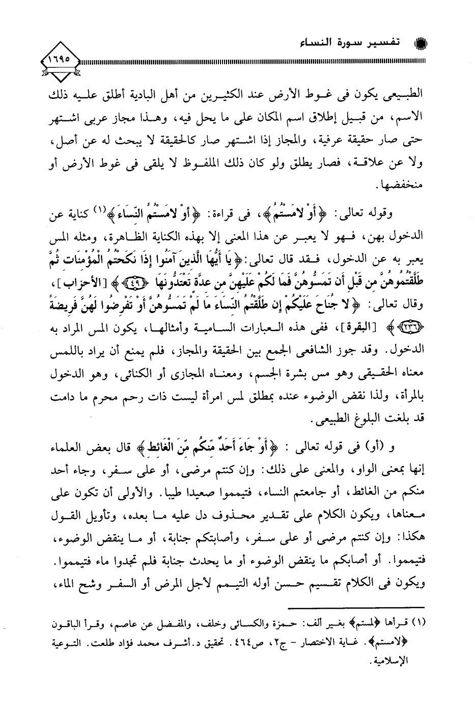 وقوله تعالى: (أَوْ لامَسْتمُ)، في قراءة: (أوْ لامَسْتم النِّسَاءَ) (¬1) كناية عن الدخول بهن، فهو لَا يعبر عن هذا المعنى إلا بهذه الكناية الظاهرة، ومثله المس يعبر به عن الدخول، فقد قال تعالى: (يَا أَيُّهَا الَّذِينَ آمَنُوا إِذَا نَكَحْتُمُ الْمُؤْمِنَاتِ ثُمَّ طَلَّقْتُمُوهُنَّ مِنْ قَبْلِ أَنْ تَمَسُّوهُنَّ فَمَا لَكُمْ عَلَيْهِنَّ مِنْ عِدَّةٍ تَعْتَدُّونَهَا). وقال تعالى: (لَا جُنَاحَ عَلَيْكُمْ إِنْ طَلَّقْتُمُ النِّسَاءَ مَا لَمْ تَمَسُّوهُنَّ أَوْ تَفْرِضُوا لَهُنَّ فَرِيضَةً)، ففي هذه العبارات السامية وأمثالها، يكون المس المراد به الدخول. وقد جوز الشافعي الجمع بين الحقيقة والمجاز، فلم يمنع أن يراد باللمس معناه الحقيقي وهو مس بشرة الجسم، ومعناه المجازي أو الكنائي، وهو الدخول بالمرأة، ولذا نقض الوضوء عنده بمطلق لمس امرأة ليست ذات رحم محرم ما دامت قد بلغت البلوغ الطبيعي.