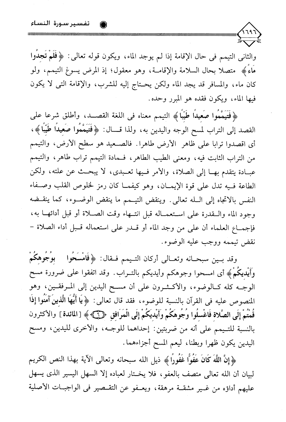 (فَتَيَمَّمُوا صَعِيدًا طَيِّبًا) التيمم معناه في اللغة القصد، وأطلق شرعا على القصد إلى التراب لمسح الوجه واليدين به، ولذا قال: (فَتَيَمَّمُوا صَعِيدًا طَيِّبًا)، أي اقصدوا ترابا على ظاهر الأرض طاهرا. فالصعيد هو سطح الأرض، والتيمم من التراب الثابت فيه، ومعنى الطيب الطاهر، فمادة التيمم تراب طاهر، والتيمم عبادة يتقدم بها إلى الصلاة، والأمر فيها تعبدي، لَا يبحث عن علته، ولكن الطاعة فيه تدل على قوة الإيمان، وهو كيفما كان رمز لخلوص القلب وصفاء النفس بالاتجاه إلى الله تعالى. وينقض التيمم ما ينقض الوضوء، كما ينقضه وجود الماء والقدرة على استعماله قبل انتهاء وقت الصلاة أو قبل أدائها به، فإجماع العلماء أن على من وجد الماء أو قدر على استعماله قبل أداء الصلاة - نقض تيممه ووجب عليه الوضوء.