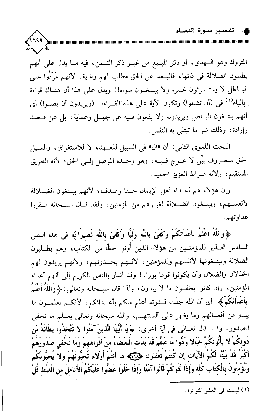 المتروك وهو الهدى، أو ذكر المبيع من غير ذكر الثمن، فيه ما يدل على أنهم يطلبون الضلالة في ذاتها، فالبعد عن الحق مطلب لهم وغاية، لأنهم مَرَدُوا على الباطل لَا يستمرئون غيره ولا يبتغون سواه!! ويدل على هذا أن هناك قراءة بالياء (¬1) في (أن تضلوا) وتكون الآية على هذه القراءة: (ويريدون أن يضلوا) أي أنهم يبتغون الباطل ويريدونه ولا يقعون فيه عن جهل وعماية، بل عن قصد وإرادة، وذلك شر ما تبتلى به النفس.