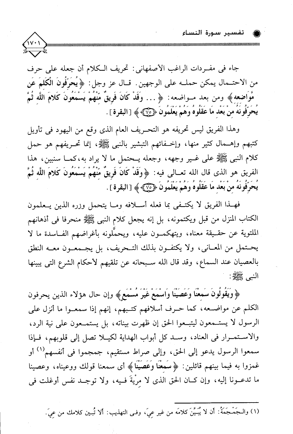وهذا الفريق ليس تحريفه هو التحريف العام الذي وقع من اليهود في تأويل كتبهم وإهمال كثير منها، وإخفائهم التبشير بالنبي - صلى الله عليه وسلم -، إنما تحريفهم هو حمل كلام النبي - صلى الله عليه وسلم - على غير وجهه، وجعله يحتمل ما لَا يراد به، كما سنبين، هذا الفريق هو الذي قال الله تعالى فيه: (وَقَدْ كَانَ فَرِيقٌ منْهُمْ يَسْمَعُونَ كَلامَ اللَّهِ ثُمَّ يُحَرِّفُونَهُ مِنْ بَعْدِ مَا عَقَلُوهُ وَهُمْ يَعْلَمُونَ).