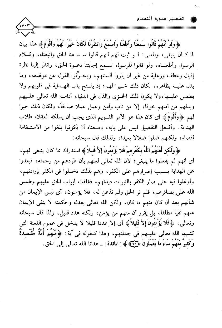 (وَلَوْ أَنَّهُمْ قَالُوا سَمِعْنَا وَأَطَعْنَا وَاسْمَعْ وَانظُرْنَا لَكَانَ خَيْرًا لَّهمْ وَأَقْوَمَ) هذا بيان لما كان ينبغي، والمعنى: لو ثبت لهم أنهم قالوا سمعنا الحق واتبعناه، وكلام الرسول وأطعناه، ولو قالوا للرسول اسمع إجابتنا دعوة الحق، وانظر إلينا نظرة إقبال وعطف ورعاية من غير أن يلووا السنتهم، ويحرِّفوا القول عن موضعه، وما يدل عليه بظاهره، لكان ذلك خيرا لهم؛ إذ يفتح باب الهداية في قلوبهم ولا يطمس عليها، ولا يكون ذلك الخزي والذل في الدنيا، أدامه الله تعالى عليهم وبدلهم من أمنهم خوفا، إلا من تاب وآمن وعمل عملا صالحاً، ولكان ذلك خيرا لهم (وَأَقْوَمَ) أي كان هذا هو الأمر القويم الذي يجب أن يسلكه العقلاء طلاب الهداية. وأفعل التفضيل ليس على بابه، ومعناه أن يكونوا بلغوا من الاستقامة أقصاه، ولكنهم ضلوا ضلالا بعيدا، ولذلك قال سبحانه: