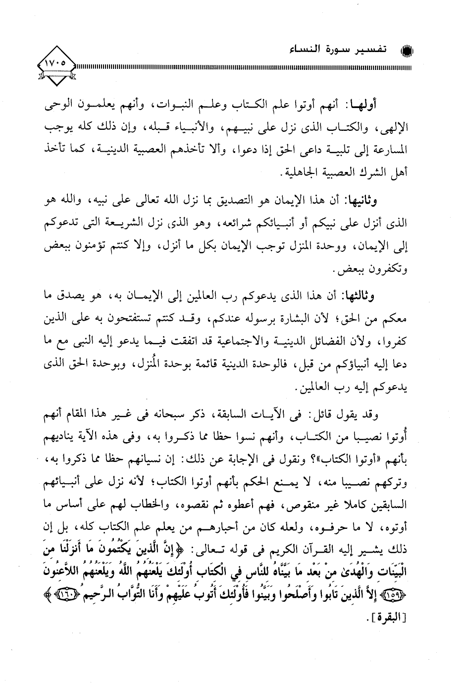 أولها: أنهم أوتوا علم الكتاب وعلم النبوات، وأنهم يعلمون الوحي الإلهي، والكتاب الذي نزل على نبيهم، والأنبياء قبله، وإن ذلك كله يوجب المسارعة إلى تلبية داعي الحق إذا دعوا، وألا تأخذهم العصبية الدينية، كما تأخذ أهل الشرك العصبية الجاهلية.