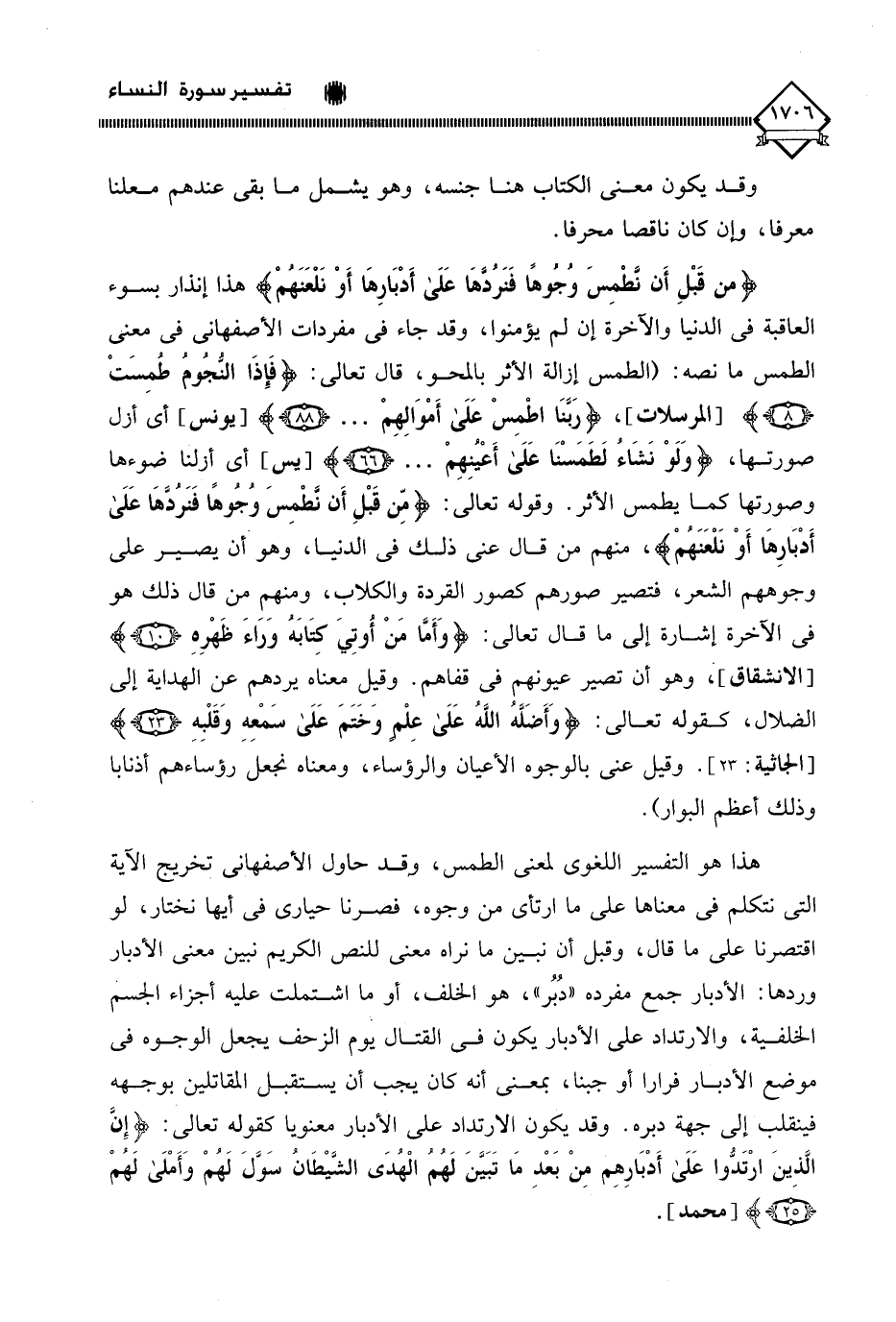 (من قَبْلِ أَن نَّطْمِسَ وُجُوهًا فَنَرُدَّهَا عَلَى أَدْبَارِهَا أَوْ نَلْعَنَهُمْ) هذا إنذار بسوء العاقبة في الدنيا والآخرة إن لم يؤمنوا، وقد جاء في مفردات الأصفهاني في معنى الطمس ما نصه: (الطمس إزالة الأثر بالمحو، قال تعالى: (فَإِذَا النُّجُومُ طُمِسَتْ) (رَبَّنَا اطْمِسْ عَلَى أَمْوَالِهِمْ. . .)، أي أزل صورتها، (وَلَوْ نَشَاءُ لَطَمَسْنَا عَلَى أَعْيُنِهِمْ. . .)، أي أزلنا ضوءها وصورتها كما يطمس الأثر. وقوله تعالى: (مِّن قَبْلِ أَن نَطْمِسَ وُجُوهًا فَنَرُدَّهَا عَلَى أَدْبَارِهَا أَوْ نَلْعَنَهُمْ)، منهم من قال عنى ذلك في الدنيا، وهو أن يصير على وجوههم الشعر، فتصير صورهم كصور القردة والكلاب، ومنهم من قال ذلك هو في الآخرة إشارة إلى ما قال تعالى: (وَأَمَّا مَنْ أُوتِيَ كِتَابَهُ وَرَاءَ ظَهْرِهِ)، وهو أن تصير عيونهم في قفاهم. وقيل معناه يردهم عن الهداية إلى الضلال، كقوله تعالى: (وَأَضَلَّهُ اللَّهُ عَلَى عِلْمٍ وَخَتَمَ عَلَى سَمْعِهِ وَقَلْبِهِ).