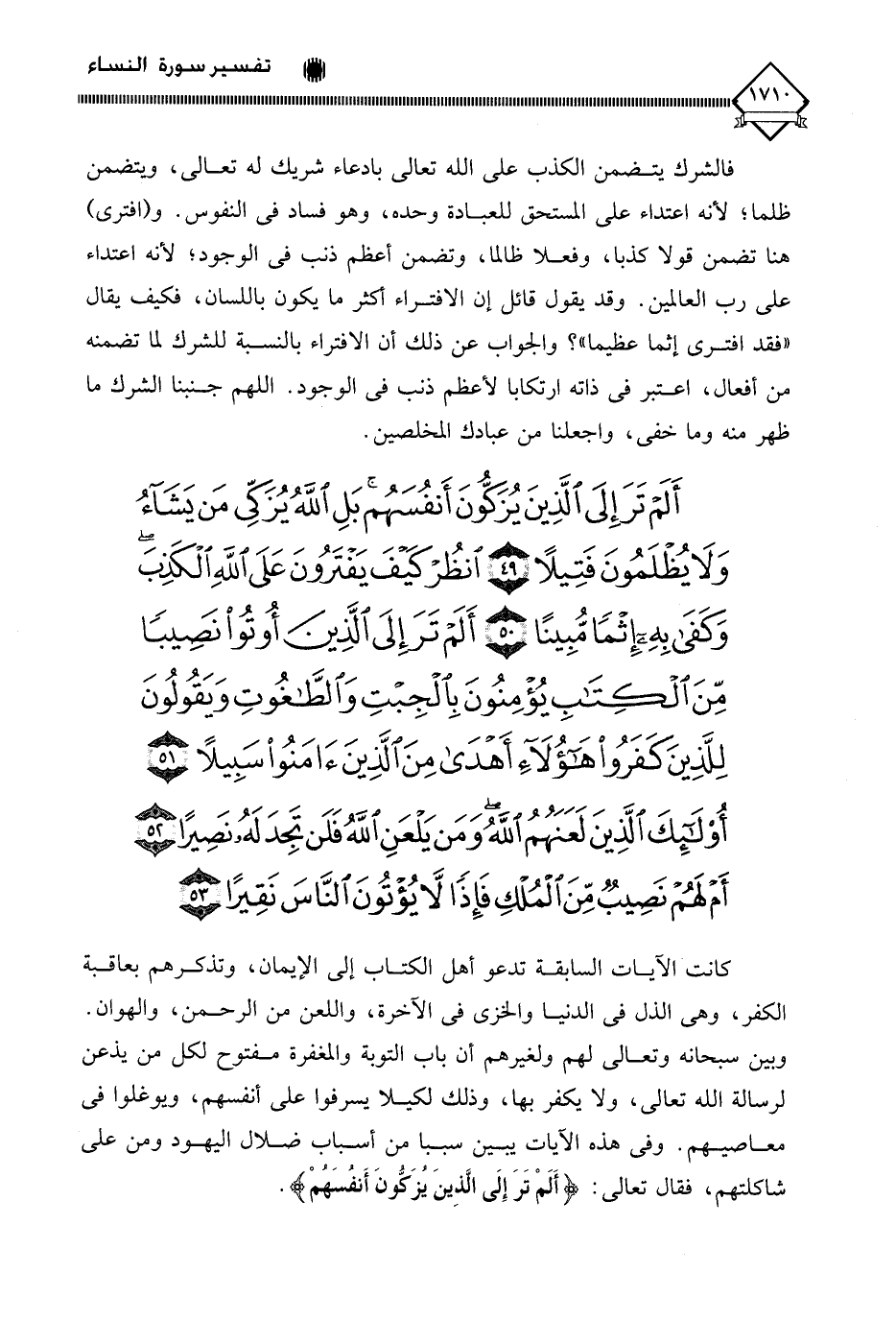 (أَلَمْ تَرَ إِلَى الَّذِينَ يُزَكُّونَ أَنْفُسَهُمْ بَلِ اللَّهُ يُزَكِّي مَنْ يَشَاءُ وَلَا يُظْلَمُونَ فَتِيلًا (49) انْظُرْ كَيْفَ يَفْتَرُونَ عَلَى اللَّهِ الْكَذِبَ وَكَفَى بِهِ إِثْمًا مُبِينًا (50) أَلَمْ تَرَ إِلَى الَّذِينَ أُوتُوا نَصِيبًا مِنَ الْكِتَابِ يُؤْمِنُونَ بِالْجِبْتِ وَالطَّاغُوتِ وَيَقُولُونَ لِلَّذِينَ كَفَرُوا هَؤُلَاءِ أَهْدَى مِنَ الَّذِينَ آمَنُوا سَبِيلًا (51) أُولَئِكَ الَّذِينَ لَعَنَهُمُ اللَّهُ وَمَنْ يَلْعَنِ اللَّهُ فَلَنْ تَجِدَ لَهُ نَصِيرًا (52) أَمْ لَهُمْ نَصِيبٌ مِنَ الْمُلْكِ فَإِذًا لَا يُؤْتُونَ النَّاسَ نَقِيرًا (53)