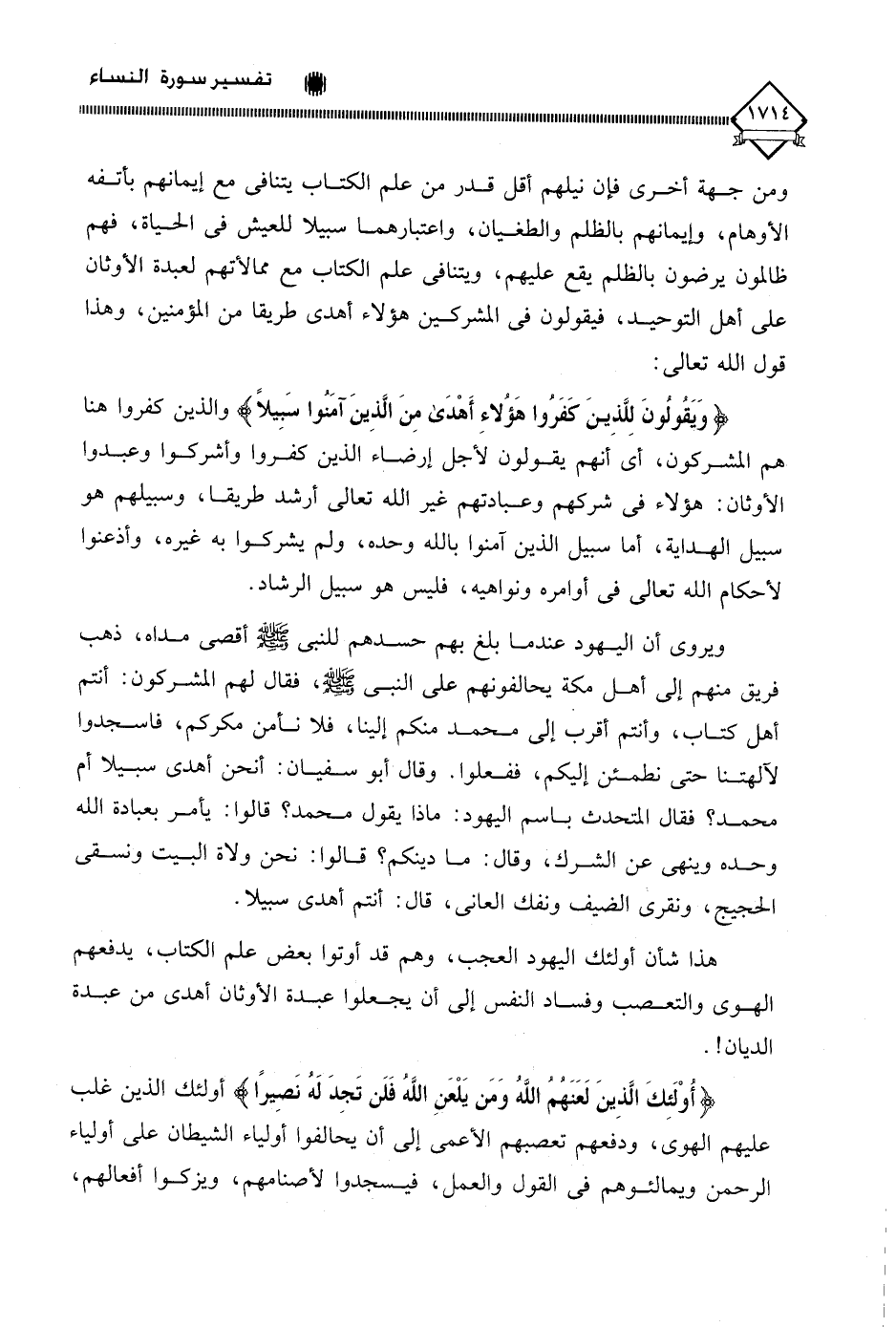 (وَيَقُولُونَ لِلَّذِينَ كَفَرُوا هَؤُلَاءِ أَهْدَى مِنَ الَّذِينَ آمَنُوا سَبِيلًا) والذين كفروا هنا هم المشركون، أي أنهم يقولون لأجل إرضاء الذين كفروا وأشركوا وعبدوا الأوثان: هؤلاء في شركهم وعبادتهم غير الله تعالى أرشد طريقا، وسبيلهم هو سبيل الهداية، أما سبيل الذين آمنوا بالله وحده، ولم يشركوا به غيره، وأذعنوا لأحكام الله تعالى في أوامره ونواهيه، فليس هو سبيل الرشاد.