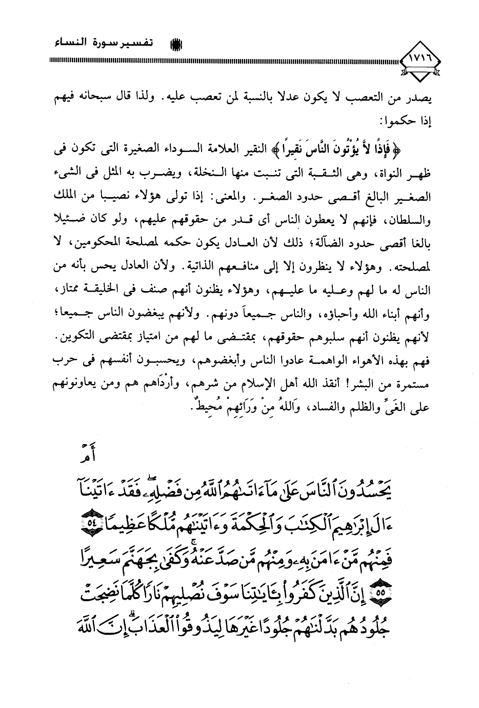 (أَمْ يَحْسُدُونَ النَّاسَ عَلَى مَا آتَاهُمُ اللَّهُ مِنْ فَضْلِهِ فَقَدْ آتَيْنَا آلَ إِبْرَاهِيمَ الْكِتَابَ وَالْحِكْمَةَ وَآتَيْنَاهُمْ مُلْكًا عَظِيمًا (54) فَمِنْهُمْ مَنْ آمَنَ بِهِ وَمِنْهُمْ مَنْ صَدَّ عَنْهُ وَكَفَى بِجَهَنَّمَ سَعِيرًا (55) إِنَّ الَّذِينَ كَفَرُوا بِآيَاتِنَا سَوْفَ نُصْلِيهِمْ نَارًا كُلَّمَا نَضِجَتْ جُلُودُهُمْ بَدَّلْنَاهُمْ جُلُودًا غَيْرَهَا لِيَذُوقُوا الْعَذَابَ إِنَّ اللَّهَ