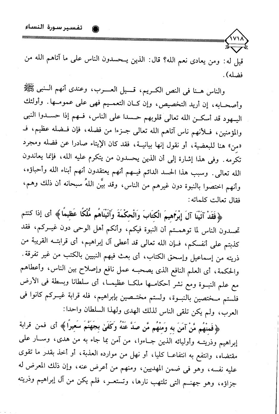 والناس هنا في النص الكريم، قيل العرب، وعندي أنهم النبي - صلى الله عليه وسلم - وأصحابه، إن أريد التخصيص، وإن كان التعميم فهي على عمومها. وأولئك اليهود قد أسكن الله تعالى قلوبهم حسدا على الناس، فهم إذا حسدوا النبي والمؤمنين، فلأنهم ناس آتاهم الله تعالى جزءا من فضله، فإن فضله عظيم، فـ " مِن " هنا للبعضية، أو نقول إنها بيانية، فقد كان الإيتاء صادرا عن فضله ومجرد تكرمه. وفي هذا إشارة إلى أن الذين يحسدون من يتكرم عليه الله، فإنما يعاندون الله تعالى. وسبب هذا الحسد الدائم فيهم أنهم يعتقدون أنهم أبناء الله وأحباؤه، وأنهم اختصوا بالنبوة دون غيرهم من الناس، وقد بيَّن اللهُ سبحانه أن ذلك وهم، فقال تعالت كلماته: