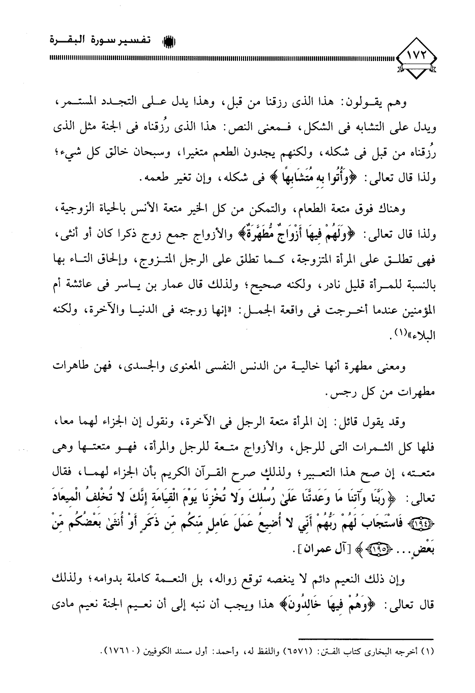 وهناك فوق متعة الطعام، والتمكن من كل الخير متعة الأنس بالحياة الزوجية، ولذا قال تعالى: (وَلَهُمْ فِيهَا أَزْوَاجٌ مطَهَّرَةٌ) والأزواج جمع زوج ذكرا كان أو أنثى، فهي تطلق على المرأة المتزوجة، كما تطلق على الرجل المتزوج، وإلحاق التاء بها بالنسبة للمرأة قليل نادر، ولكنه صحيح، ولذلك قال عمار بن ياسر في عائشة أم المؤمنين عندما أخرجت في واقعة الجمل: " إنها زوجته في الدنيا والآخرة، ولكنه البلاء " (¬1).