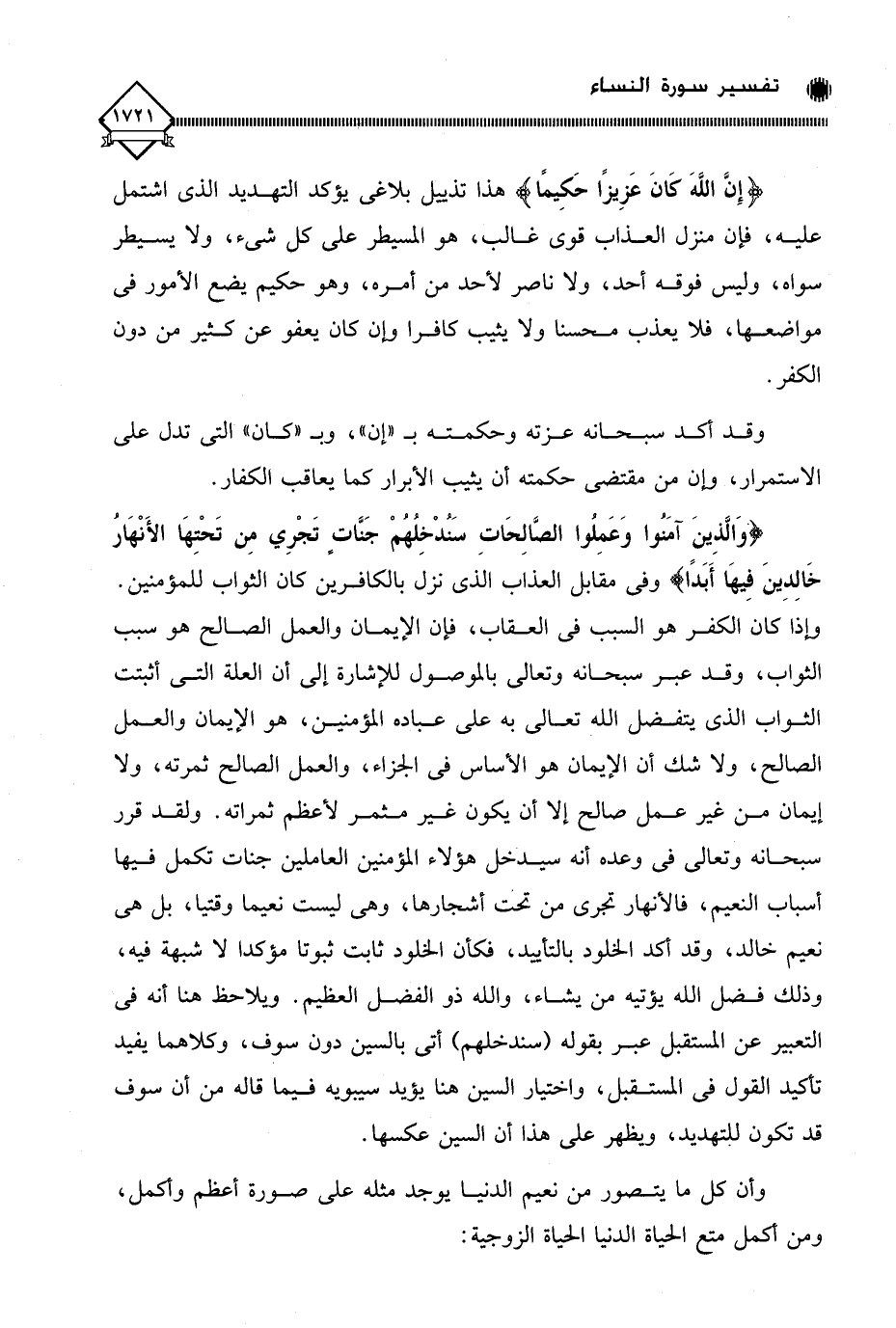 وإذا كان الكفر هو السبب في العقاب، فإن الإيمان والعمل الصالح هو سبب الثواب، وقد عبر سبحانه وتعالى بالموصول للإشارة إلى أن العلة التي أثبتت الثواب الذي يتفضل الله تعالى به على عباده المؤمنين، هو الإيمان والعمل الصالح، ولا شك أن الإيمان هو الأساس في الجزاء، والعمل الصالح ثمرته، ولا إيمان من غير عمل صالح إلا أن يكون غير مثمر لأعظم ثمراته. ولقد قرر سبحانه وتعالى في وعده أنه سيدخل هؤلاء المؤمنين العاملين جنات تكمل فيها أسباب النعيم، فالأنهار تجري من تحت أشجارها، وهي ليست نعيما وقتيا، بل هي نعيم خالد، وقد أكد الخلود بالتأييد، فكأن الخلود ثابت ثبوتا مؤكدا لَا شبهة فيه، وذلك فضل الله يؤتيه من يشاء، والله ذو الفضل العظيم. ويلاحظ هنا أنه في التعبير عن المستقبل عبر بقوله (سندخلهم) أتى بالسين دون سوف، وكلاهما يفيد تأكيد القول في المستقبل، واختيار السين هنا يؤيد سيبويه فيما قاله من أن سوف