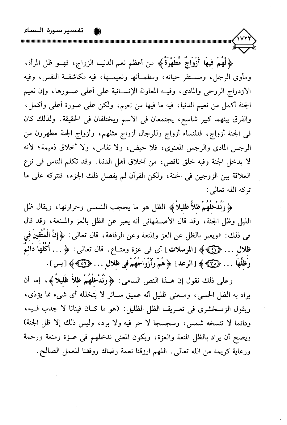 وعلى ذلك نقول إن هذا النص السامي: (وَنُدْخِلُهُمْ ظِلًّا ظَلِيلًا)، إما أن يراد به الظل الحسي، ومعنى ظليل أنه عميق ساتر لَا يتخلله أي شيء مما يؤذي، ويقول الزمخشري في تعريف الظل الظليل: (هو ما كان فينانا لَا جدب فيه، ودائما لَا تنسخه شمس، وسجسجا لَا حر فيه ولا برد، وليس ذلك إلا ظل الجنة) ويصح أن يراد بالظل المنعة والعزة، ويكون المعنى ندخلهم في عزة ومنعة ورحمة ورعاية كريمة من الله تعالى. اللهم ارزقنا نعمة رضاك ووفقنا للعمل الصالح.