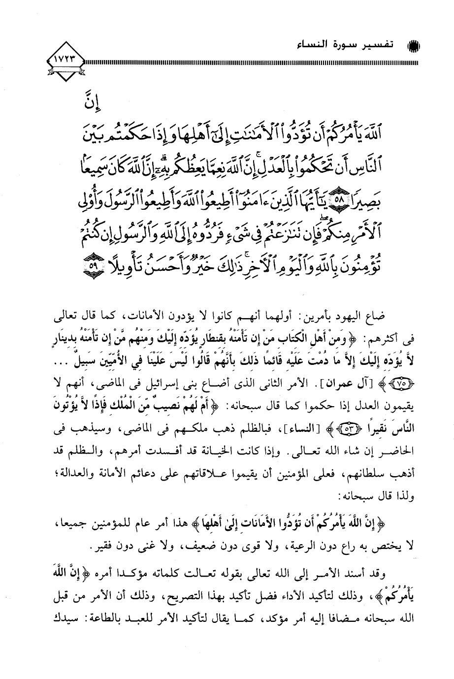 (إِنَّ اللَّهَ يَأْمُرُكُمْ أَنْ تُؤَدُّوا الْأَمَانَاتِ إِلَى أَهْلِهَا وَإِذَا حَكَمْتُمْ بَيْنَ النَّاسِ أَنْ تَحْكُمُوا بِالْعَدْلِ إِنَّ اللَّهَ نِعِمَّا يَعِظُكُمْ بِهِ إِنَّ اللَّهَ كَانَ سَمِيعًا بَصِيرًا (58) يَا أَيُّهَا الَّذِينَ آمَنُوا أَطِيعُوا اللَّهَ وَأَطِيعُوا الرَّسُولَ وَأُولِي الْأَمْرِ مِنْكُمْ فَإِنْ تَنَازَعْتُمْ فِي شَيْءٍ فَرُدُّوهُ إِلَى اللَّهِ وَالرَّسُولِ إِنْ كُنْتُمْ تُؤْمِنُونَ بِاللَّهِ وَالْيَوْمِ الْآخِرِ ذَلِكَ خَيْرٌ وَأَحْسَنُ تَأْوِيلًا (59)