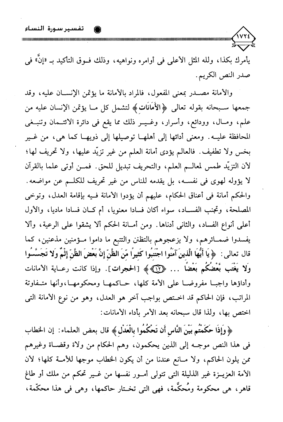 والحكم أمانة في أعناق الحكام، عليهم أن يؤدوا الأمانة فيه بإقامة العدل، وتوخي المصلحة، وتجنب الفساد، سواء أكان فسادا معنويا، أم كان فسادا ماديا، والأول أعلى أنواع الفساد، والثاني أدناها. ومن أمانة الحكم ألا يشقوا على الرعية، وألا يفسدوا ضمائرهم، ولا يزعجوهم بالتظنن والتتبع ما داموا مؤمنين مذعنين، كما قال تعالى: (يَا أَيُّهَا الَّذِينَ آمَنوا اجْتَنِبُوا كَثِيرًا مِّنَ الظَّنِّ إِنَّ بَعْضَ الظَّنِّ إِثْمٌ وَلا تَجَسَّسُوا وَلا يَغْتَب بَّعْضُكُم بَعْضًا. . .). وإذا كانت رعاية الأمانات وأداؤها واجبا مفروضا على الأمة كلها، حاكمها ومحكومها، وأنها متفاوتة المراتب، فإن الحاكم قد اختص بواجب آخر هو العدل، وهو من نوع الأمانة التي اختص بها، ولذا قال سبحانه بعد الأمر بأداء الأمانات:
