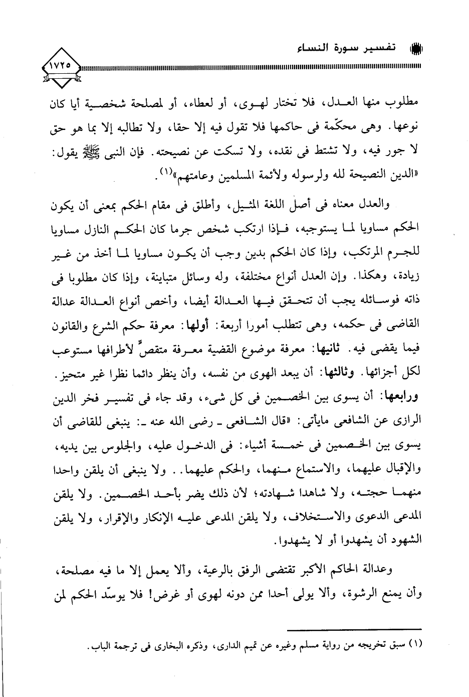 والعدل معناه في أصل اللغة المثيل، وأطلق في مقام الحكم بمعنى أن يكون الحكم مساويا لما يستوجبه، فماذا ارتكب شخص جرما كان الحكم النازل مساويا للجرم المرتكب، وإذا كان الحكم بدين وجب أن يكون مساويا لما أخذ من غير زيادة، وهكذا. وإن العدل أنواع مختلفة، وله وسائل متباينة، وإذا كان مطلوبا في ذاته فوسائله يجب أن تتحقق فيها العدالة أيضا، وأخص أنواع العدالة عدالة القاضي في حكمه، وهي تتطلب أمورا أربعة: أولها: معرفة حكم الشرع والقانون فيما يقضى فيه. ثانيها؛ معرفة موضوع القضية معرفة متقصٍّ لأطرافها مستوعب لكل أجزائها. وثالثها: أن يبعد الهوى من نفسه، وأن ينظر دائما نظرا غير متحيز.