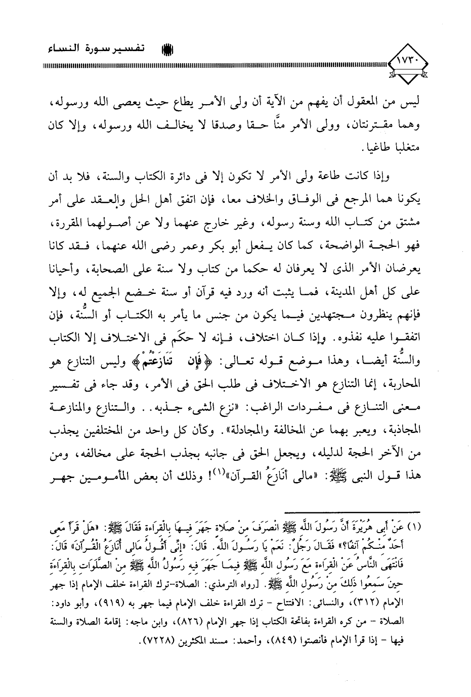 وإذا كانت طاعة ولي الأمر لَا تكون إلا في دائرة الكتاب والسنة، فلا بد أن يكونا هما المرجع في الوفاق والخلاف معا، فإن اتفق أهل الحَل والعقد على أمر مشتق من كتاب الله وسنة رسوله، وغير خارج عنهما ولا عن أصولهما المقررة، فهو الحجة الواضحة، كما كان يفعل أبو بكر وعمر رضي الله عنهما، فقد كانا يعرضان الأمر الذي لَا يعرفان له حكما من كتاب ولا سنة على الصحابة، وأحيانا على كل أهل المدينة، فما يثبت أنه ورد فيه قرآن أو سنة خضع الجميع له، وإلا فإنهم ينظرون مجتهدين فيما يكون من جنس ما يأمر به الكتاب أو السُّنَّة، فإن اتفقوا عليه نفذوه. وإذا كان اختلاف، فإنه لَا حكَم في الاختلاف إلا الكتاب والسُّنة أيضا، وهذا موضع قوله تعالى: (فَإِن تَنَازَعْتمْ) وليس التنازع هو المحاربة، إنما التنازع هو الاختلاف في طلب الحق في الأمر، وقد جاء في تفسير معنى التنازع في مفردات الراغب: " نزع الشيء جذبه. . والتنازع والمنازعة المجاذبة، ويعبر بهما عن المخالفة والمجادلة ". وكأن كل واحد من المختلفين يجذب من الآخر الحجة لدليله، ويجعل الحق في جانبه بجذب الحجة على مخالفه، ومن هذا قول النبي - صلى الله عليه وسلم -: " ما لي أنَازعُ القرآن " (¬1)! وذلك أن بعض المأمومين جهر