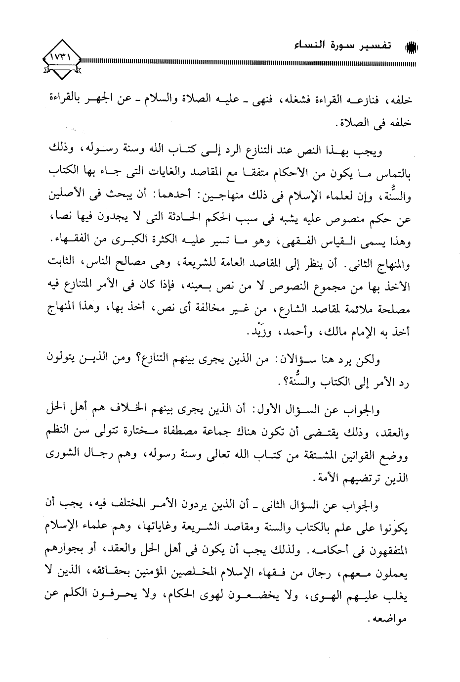 ويجب بهذا النص عند التنازع الرد إلى كتاب الله وسنة رسوله، وذلك بالتماس ما يكون من الأحكام متفقا مع المقاصد والغايات التي جاء بها الكتاب والسُّنة، وإن لعلماء الإسلام في ذلك منهاجين: أحدهما: أن يبحث في الأصلين عن حكم منصوص عليه يشبه في سبب الحكم الحادثة التي لَا يجدون فيها نصا، وهذا يسمى القياس الفقهي، وهو ما تسير عليه الكثرة الكبرى من الفقهاء. والمنهاج الثاني. أن ينظر إلى المقاصد العامة للشريعة، وهي مصالح الناس، الثابت الأخذ بها من مجموع النصوص لَا من نص بعينه، فإذا كان في الأمر المتنازع فيه مصلحة ملائمة لمقاصد الشارع، من غير مخالفة أي نص، أخذ بها، وهذا المنهاج أخذ به الإمام مالك، وأحمد، وزَيْد.