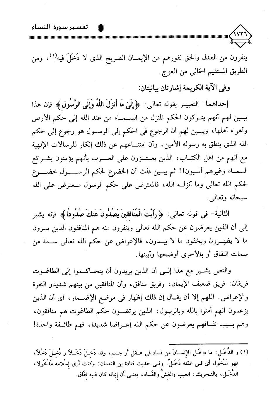 الثانية - في قوله تعالى: (رَأَيْتَ الْمُنَافِقِينَ يَصُدُّونَ عَنْكَ صُدُودًا) فإنه يشير إلى أن الذين يعرضون عن حكم الله تعالى وينفرون منه هم المنافقون الذين يسرون ما لَا يظهرون ويخفون ما لَا يبدون، فالإعراض عن حكم الله تعالى سمة من سمات النفاق أو بالأحرى أوضحها وأبينها.