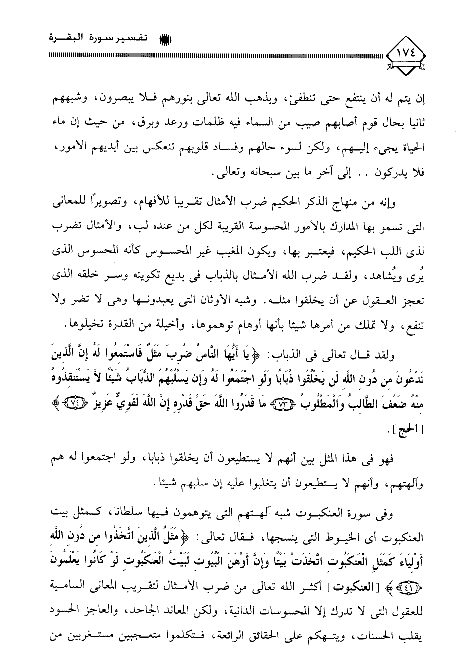 فهو في هذا المثل بين أنهم لَا يستطيعون أن يخلقوا ذبابا، ولو اجتمعوا له هم وآلهتهم، وأنهم لَا يستطيعون أن يتغلبوا عليه إن سلبهم شيئا. وفى سورة العنكبوت شبه آلهتهم التي يتوهمون فيها سلطانا، كمثل بيت العنكبوت أي الخيوط التي ينسجها، فقال تعالى: (مَثَلُ الَّذِينَ اتَّخَذُوا مِن دُونِ اللَّهِ أَوْلِيَاءَ كَمَثَلِ الْعَنكَبُوتِ اتَّخَذَتْ بَيْتًا وَإِنَّ أَوْهَنَ الْبُيُوتِ لَبَيْتُ الْعَنكَبُوتِ لَوْ كَانُوا يَعْلَمُونَ)، أكثر الله تعالى من ضرب الأمثال لتقريب المعاني السامية للعقول التي لَا تدرك إلا المحسوسات الدانية، ولكن المعاند الجاحد، والعاجز الحسود يقلب الحسنات، ويتهكم على الحقائق الرائعة، فتكلموا متعجبين مستغربين من