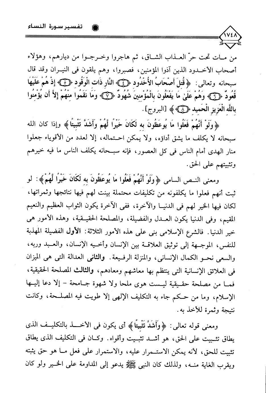 ومعنى النص السامي (وَلَوْ أَنَّهُمْ فَعَلُوا مَا يُوعَظُونَ بِهِ لكَانَ خَيْرًا لَّهُمْ): لو ثبت أنهم فعلوا ما يكلفونه من تكليفات محتملة بينت لهم فيها نتائجها وثمراتها، لكان فيها الخير لهم في الدنيا والآخرة، ففي الآخرة يكون الثواب العظيم والنعيم المقيم، وفي الدنيا يكون العدل والفضيلة، والمصلحة الحقيقية، وهذه الأمور هي خير الدنيا. فالشرع الإسلامي بني على هذه الأمور الثلاثة: الأول الفضيلة المهذبة للنفس، الموجهة إلى توثيق العلاقة بين الإنسان وأخيه الإنسان، والعبد وربه، والسعي نحو الكمال الإنساني، والمنزلة الرفيعة. والثاني العدالة التي هي الميزان في العلائق الإنسانية التي ينتظم بها معاشهم ومعادهم، والثالث المصلحة الحقيقية، فما من مصلحة حقيقية ليست هوى ملحا ولا شهوة جامحة - إلا دعا إليها الإسلام، وما من حكم جاء به التكليف الإلهي إلا طويت فيه المصلحة، وكانت نتيجة وثمرة للأخذ به.
