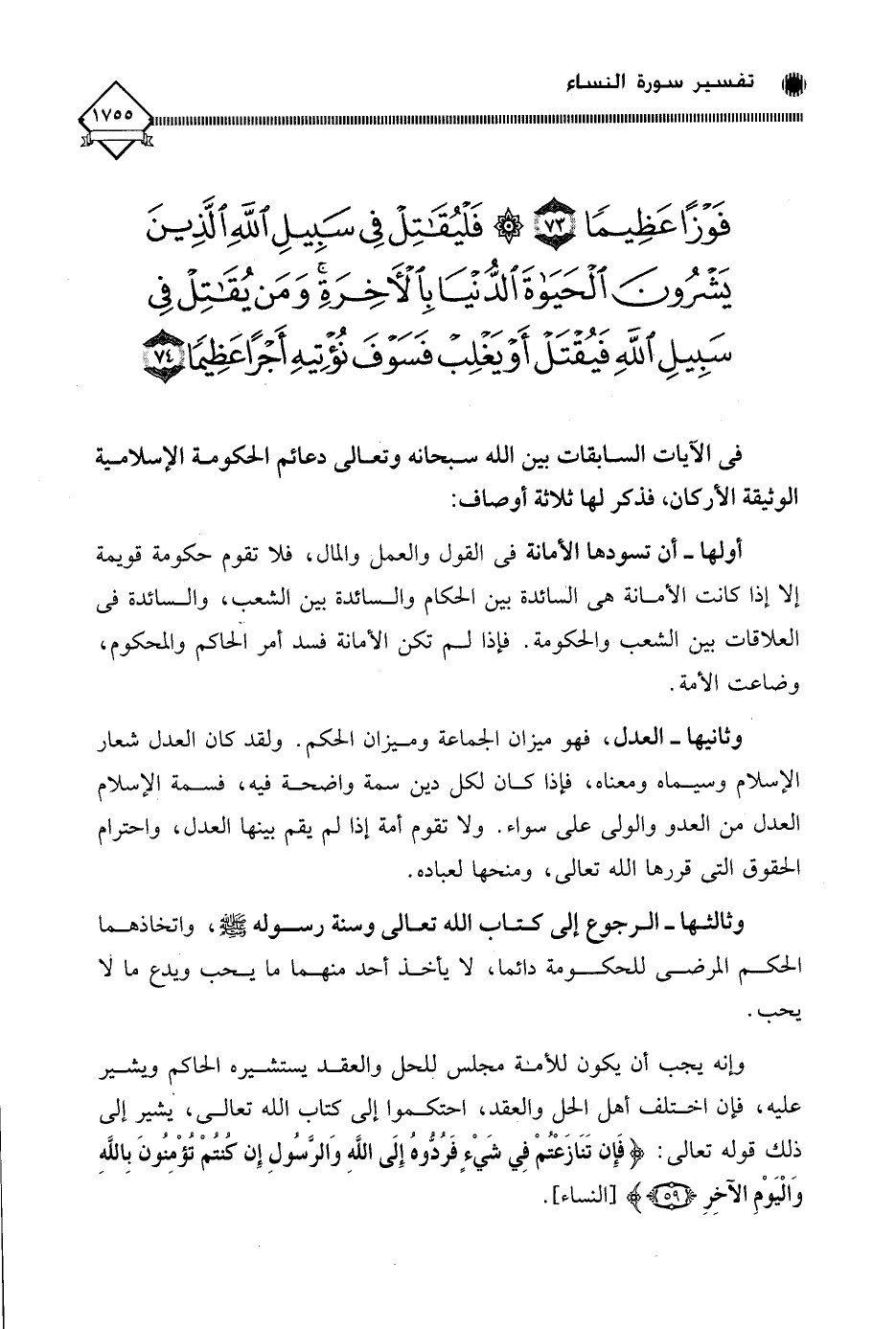 وثالثها - الرجوع إلى كتاب الله تعالى وسنة رسوله - صلى الله عليه وسلم -، واتخاذهما الحكم المرضي للحكومة دائما، لَا يأخذ أحد منهما ما يحب ويدع ما لا وإنه يجب أن يكون للأمة مجلس للحل والعقد يستشيره الحاكم ويشير عليه، فإن اختلف أهل الْحَلِّ والعَقْدِ، احتكموا إلى كتاب الله تعالى، يشير إلى ذلك قوله تعالى: (فَإِن تَنَازَعْتُمْ فِي شَيْءٍ فَرُدُّوهُ إِلَى اللَّهِ وَالرَّسُولِ إِن كنتُمْ تُؤْمِنُونَ بِاللَّه وَالْيَوْمِ الآخِرِ).