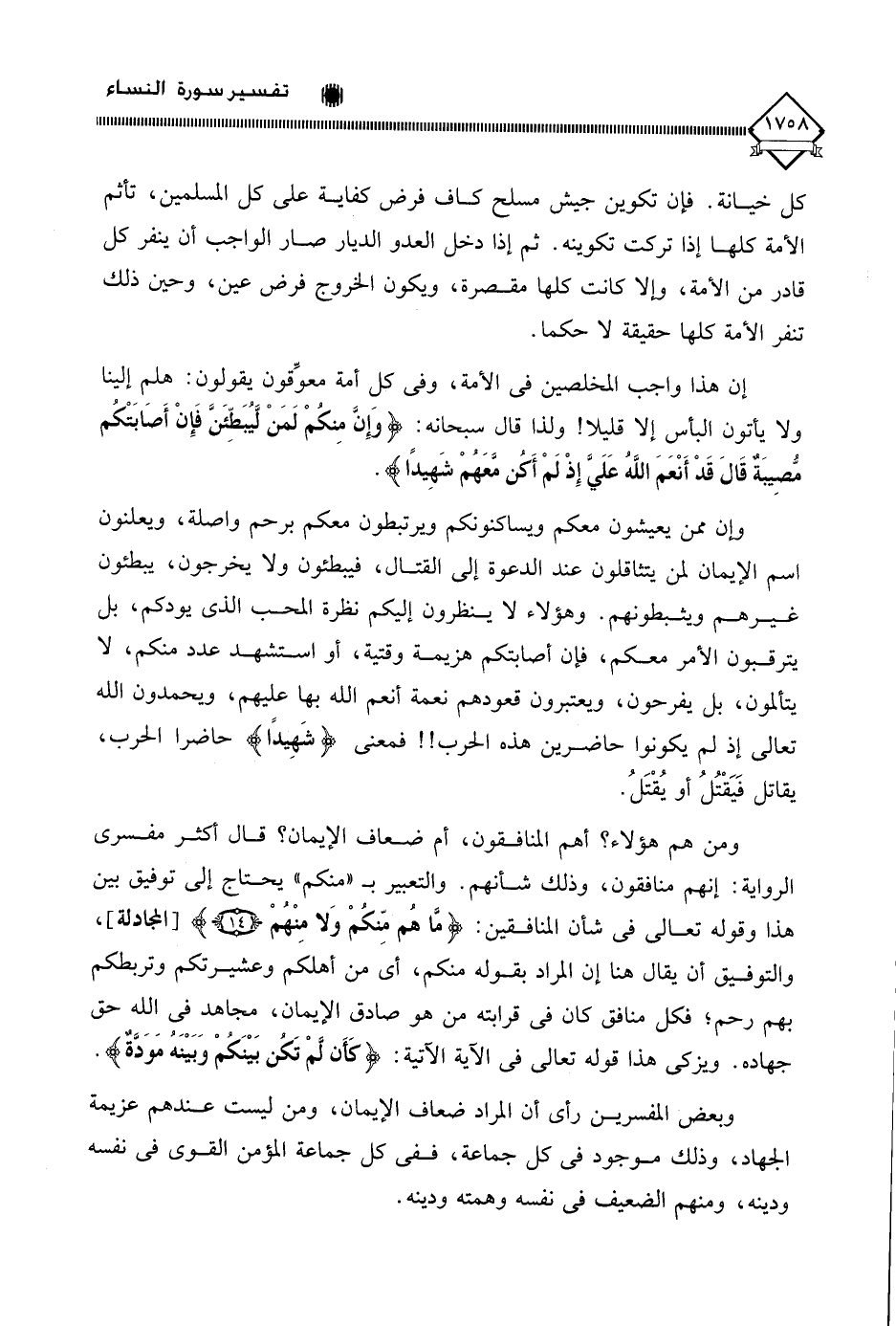 وإن ممن يعيشون معكم ويساكنونكم ويرتبطون معكم برحم واصلة، ويعلنون اسم الإيمان لمن يتثاقلون عند الدعوة إلى القتال، فيبطئون ولا يخرجون، يبطئون غيرهم ويثبطونهم. وهؤلاء لَا ينظرون إليكم نظرة الحب الذي يودكم، بل يتوقبون الأمر معكم، فإن أصابتكم هزيمة وقتية، أو استشهد عدد منكم، لا يتألمون، بل يفرحون، ويعتبرون قعودهم نعمة أنعم الله بها عليهم، ويحمدون الله تعالى إذ لم يكونوا حاضرين هذه الحرب!! فمعنى (شَهِيدًا) حاضرا الحرب، يقاتل فَيَقْتُلُ أو يُقْتَلُ.