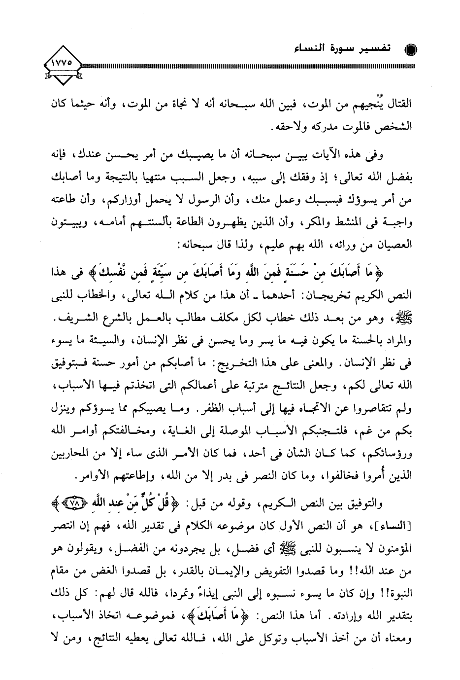 والتوفيق بين النص الكريم، وقوله من قبل: (قُلْ كُل مِّنْ عِندِ اللَّهِ)، هو أن النص الأول كان موضوعه الكلام في تقدير الله، فهم إن انتصر المؤمنون لَا ينسبون للنبي - صلى الله عليه وسلم - أي فضل، بل يجردونه من الفضل، ويقولون هو من عند الله!! وما قصدوا التفويض والإيمان بالقدر، بل قصدوا الغض من مقام النبوة!! وإن كان ما يسوء نسبوه إلى النبي إيذاءً وتمردا، فالله قال لهم: كل ذلك بتقدير الله وإرادته. أما هذا النص: (مَا أَصَابَكَ)، فموضوعه اتخاذ الأسباب، ومعناه أن من أخذ الأسباب وتوكل على الله، فالله تعالى يعطيه النتائج، ومن