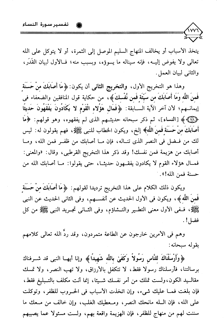 وهذا هو التخريج الأول، والتخريج الثاني أن يكون: (مَا أَصَابَكَ مِنْ حَسَنَةٍ فَمِنَ اللَّهِ وَمَا أَصَابَكَ مِن سَيِّئَةٍ فَمِن نَّفْسكَ)، من حكاية قول المنافقين والضعفاء في إيمانهم، لأن آخر الآية السابقة: (فَمَالِ هَؤُلَاءِ الْقَوْمِ لَا يَكَادُونَ يَفْقَهُونَ حَدِيثًا)، ثم ذكر سبحانه حديثهم الذي لم يفقهوه، وهو قولهم: (مَا أَصَابَكَ مِنْ حَسَنَةٍ فَمِنَ اللَّهِ) إلخ، ويكون الخطاب للنبي - صلى الله عليه وسلم -، فهم يقولون: ليس لك من فضل في النصر الذي تناله، فإن ما أصابك من ظفر فمن الله، وما أصابك من هزيمة فمن نفسك! وقد ذكر هذا التخريج القرطبي، وقال: " والمعنى: فمال هؤلاء القوم لَا يكادون يفقهون حديثا، حتى يقولوا: ما أصابك الله من حسنة فمن الله! ".