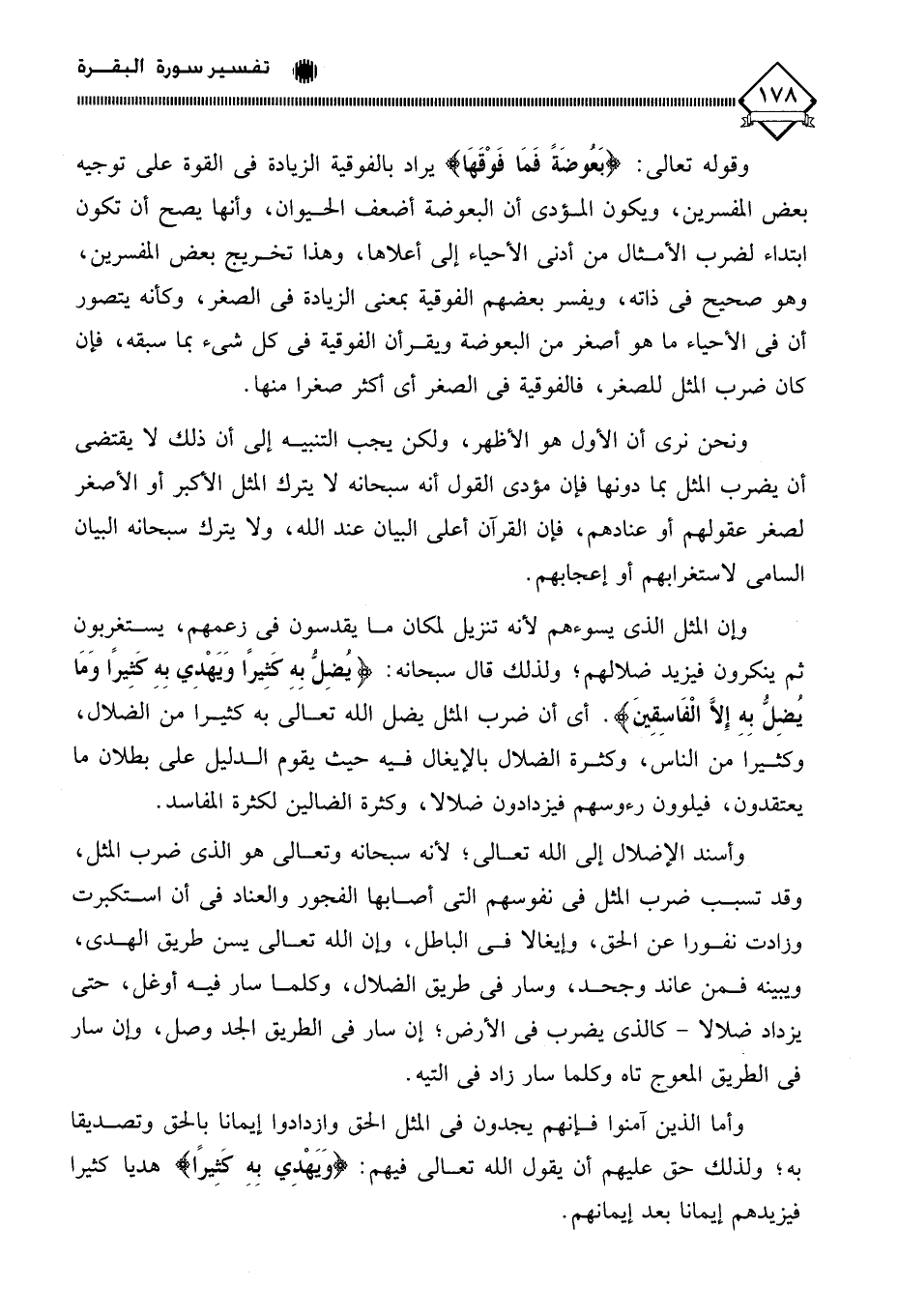 وإن المثل الذي يسوءهم لأنه تنزيل لمكان ما يقدسون في زعمهم، يستغربون ثم ينكرون فيزيد ضلالهم؛ ولذلك قال سبحانه: يُضِلُّ بِهِ كَثِيرًا وَيَهْدِي بِهِ كَثِيرًا وَمَا يُضِلُّ بِهِ إِلَّا الْفَاسِقِينَ). أي أن ضرب المثل يضل الله تعالى به كثيرا من الضلال، وكثيرا من الناس، وكثرة الضلال بالإيغال فيه حيث يقوم الدليل على بطلان ما يعتقدون، فيلوون رءوسهم فيزدادون ضلالا، وكثرة الضالين لكثرة المفاسد.