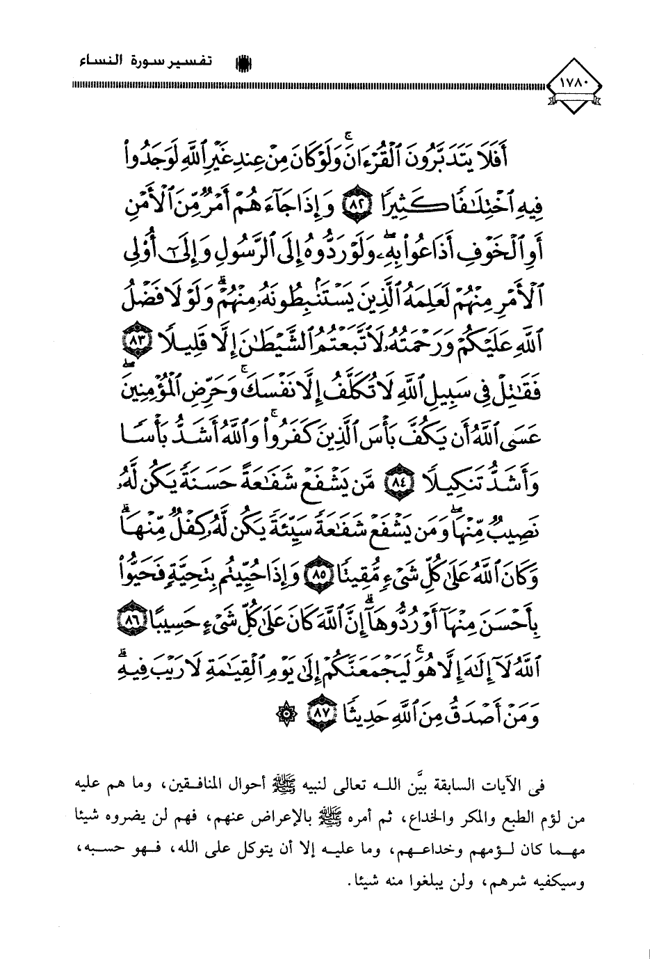 (أَفَلَا يَتَدَبَّرُونَ الْقُرْآنَ وَلَوْ كَانَ مِنْ عِنْدِ غَيْرِ اللَّهِ لَوَجَدُوا فِيهِ اخْتِلَافًا كَثِيرًا (82) وَإِذَا جَاءَهُمْ أَمْرٌ مِنَ الْأَمْنِ أَوِ الْخَوْفِ أَذَاعُوا بِهِ وَلَوْ رَدُّوهُ إِلَى الرَّسُولِ وَإِلَى أُولِي الْأَمْرِ مِنْهُمْ لَعَلِمَهُ الَّذِينَ يَسْتَنْبِطُونَهُ مِنْهُمْ وَلَوْلَا فَضْلُ اللَّهِ عَلَيْكُمْ وَرَحْمَتُهُ لَاتَّبَعْتُمُ الشَّيْطَانَ إِلَّا قَلِيلًا (83) فَقَاتِلْ فِي سَبِيلِ اللَّهِ لَا تُكَلَّفُ إِلَّا نَفْسَكَ وَحَرِّضِ الْمُؤْمِنِينَ عَسَى اللَّهُ أَنْ يَكُفَّ بَأْسَ الَّذِينَ كَفَرُوا وَاللَّهُ أَشَدُّ بَأْسًا وَأَشَدُّ تَنْكِيلًا (84) مَنْ يَشْفَعْ شَفَاعَةً حَسَنَةً يَكُنْ لَهُ نَصِيبٌ مِنْهَا وَمَنْ يَشْفَعْ شَفَاعَةً سَيِّئَةً يَكُنْ لَهُ كِفْلٌ مِنْهَا وَكَانَ اللَّهُ عَلَى كُلِّ شَيْءٍ مُقِيتًا (85) وَإِذَا حُيِّيتُمْ بِتَحِيَّةٍ فَحَيُّوا بِأَحْسَنَ مِنْهَا أَوْ رُدُّوهَا إِنَّ اللَّهَ كَانَ عَلَى كُلِّ شَيْءٍ حَسِيبًا (86) اللَّهُ لَا إِلَهَ إِلَّا هُوَ لَيَجْمَعَنَّكُمْ إِلَى يَوْمِ الْقِيَامَةِ لَا رَيْبَ فِيهِ وَمَنْ أَصْدَقُ مِنَ اللَّهِ حَدِيثًا (87)