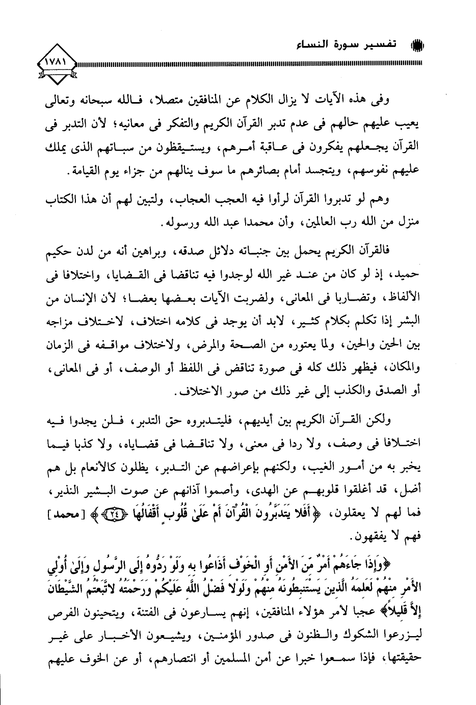 وفى هذه الآيات لَا يزال الكلام عن المنافقين متصلا، فالله سبحانه وتعالى يعيب عليهم حالهم في عدم تدبر القرآن الكريم والتفكر في معانيه؛ لأن التدبر في القرآن يجعلهم يفكرون في عاقبة أمرهم، ويستيقظون من سباتهم الذي يملك عليهم نفوسهم، ويتجسد أمام بصائرهم ما سوف ينالهم من جزاء يوم القيامة.