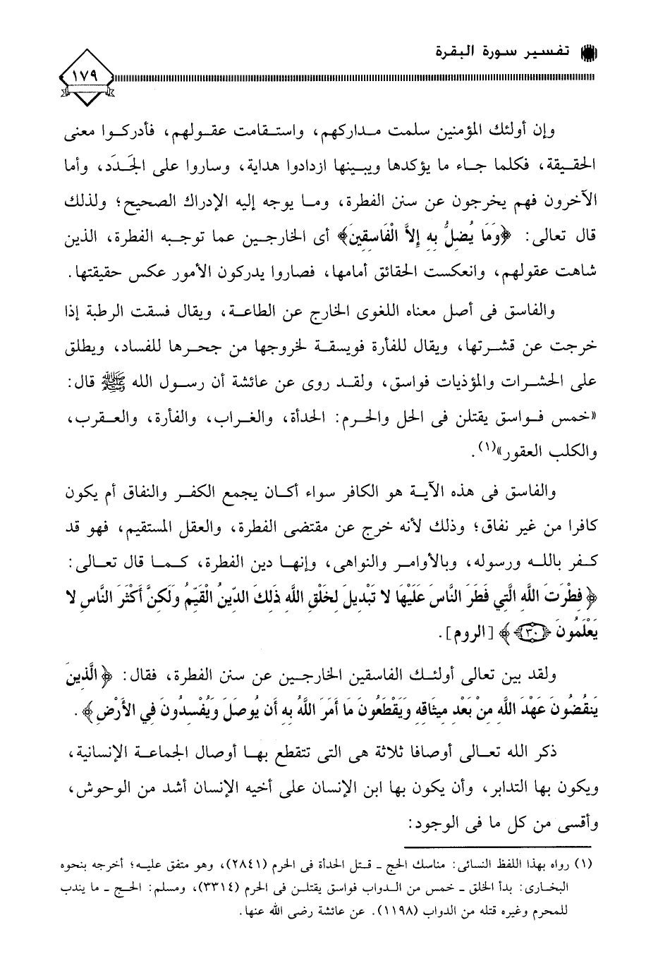 وإن أولئك المؤمنين سلمت مداركهم، واستقامت عقولهم، فأدركوا معنى الحقيقة، فكلما جاء ما يؤكدها ويبينها ازدادوا هداية، وساروا على الجَدَد، وأما الآخرون فهم يخرجون عن سن الفطرة، وما يوجه إليه الإدراك الصحيح؛ ولذلك قال تعالى: (وَمَا يُضِلُّ بِهِ إِلَّا الْفَاسِقِينَ) أي الخارجين عما توجبه الفطرة، الذين شاهت عقولهم، وانعكست الحقائق أمامها، فصاروا يدركون الأمور عكس حقيقتها. والفاسق في أصل معناه اللغوي الخارج عن الطاعة، ويقال فسقت الرطبة إذا خرجت عن قشرتها، ويقال للفأرة فويسقة لخروجها من جحرها للفساد، ويطلق على الحشرات والمؤذيات فواسق، ولقد روي عن عائشة أن رسول الله - صلى الله عليه وسلم - قال: " خمس فواسق يقتلن في الحل والحرم: الحدأة، والغراب، والفأرة، والعقرب، والكلب العقور " (¬1).