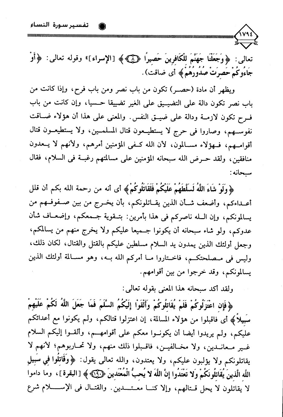 ويظهر أن مادة (حصر) تكون من باب نصر ومن باب فرح، وإذا كانت من باب نصر تكون دالة على التضييق على الغير تضييقا حسيا، وإن كانت من باب فرح تكون لازمة ودالة على ضيق النفس. والمعنى على هذا أن هؤلاء ضاقت نفوسهم، وصاروا في حرج لَا يستطيعون قتال المسلمين، ولا يستطيعون قتال أقوامهم، فهؤلاء مسالمون، لأن الله كفى المؤمنين أمرهم، ولأنهم لَا يعدون منافقين، ولقد حرض الله سبحانه المؤمنين على مسالمتهم رغبة في السلام، فقال سبحانه: