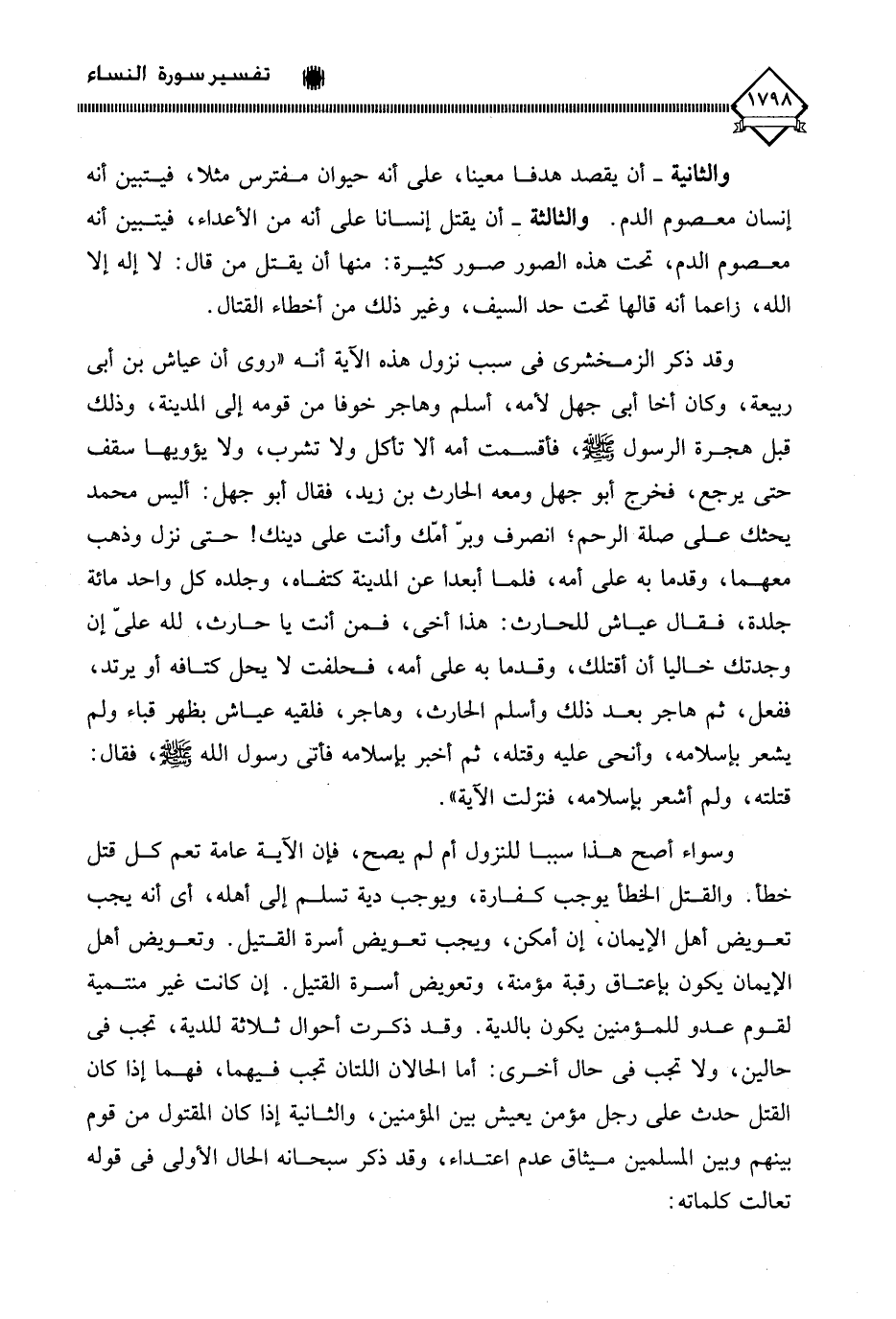 وسواء أصح هذا سببا للنزول أم لم يصح، فإن الآية عامة تعم كل قتل خطأ. والقتل الخطأ يوجب كفارة، ويوجب دية تسلم إلى أهله، أي أنه يجب تعويض أهل الإيمان، إن أمكن، ويجب تعويض أسرة القتيل. وتعويض أهل الإيمان يكون بإعتاق رقبة مؤمنة، وتعويض أسرة القتيل. إن كانت غير منتمية لقوم عدو للمؤمنين يكون بالدية. وقد ذكرت أحوال ثلاثة للدية، تجب في حالين، ولا تجب في حال أخرى: أما الحالان اللتان تجب فيهما، فهما إذا كان القتل حدث على رجل مؤمن يعيش بين المؤمنين، والثانية إذا كان المقتول من قوم بينهم وبين المسلمين ميثاق عدم اعتداء، وقد ذكر سبحانه الحال الأولى في قوله تعالت كلماته: